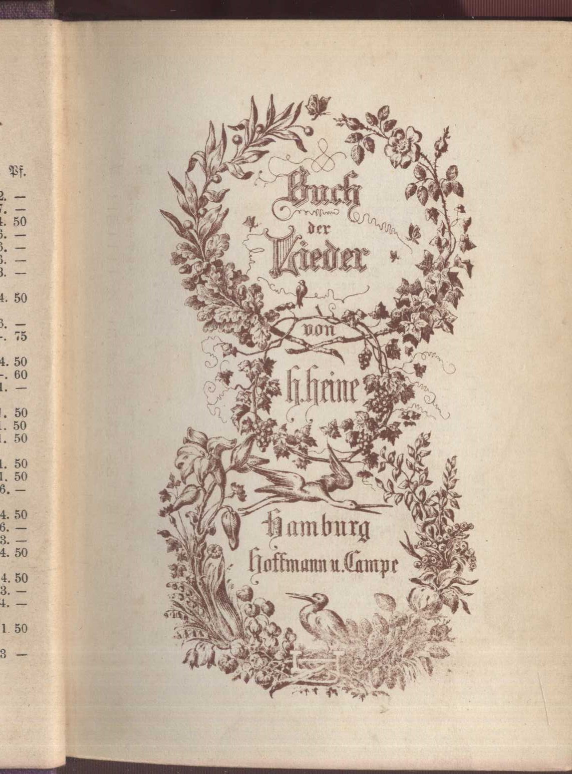 Title information Buch der Lieder / von Heinrich Heine Personal name Heine, Heinrich, 1797-1856 (Author) Další autoři Hoffmann und Campe (nakladatelství) (Publisher) Bär & Hermann (tiskárna) (Printer) Edition statement Neunundvierzigste Auflage Publication Hamburg : Hoffmann & Campe, 1882 Manufacture Bär & Hermann) Scope xvi, 360 s., [1] l. obr. příl. ISBN (váz.) Country Germany Language German Note Celoplátěná vazba, bohatě zdobena zlacenou ražbou a se zlatou ořízkou. - Sazba gotikou. - Alternativní titulní list (ilustrovaný) jako obrazová příloha. -