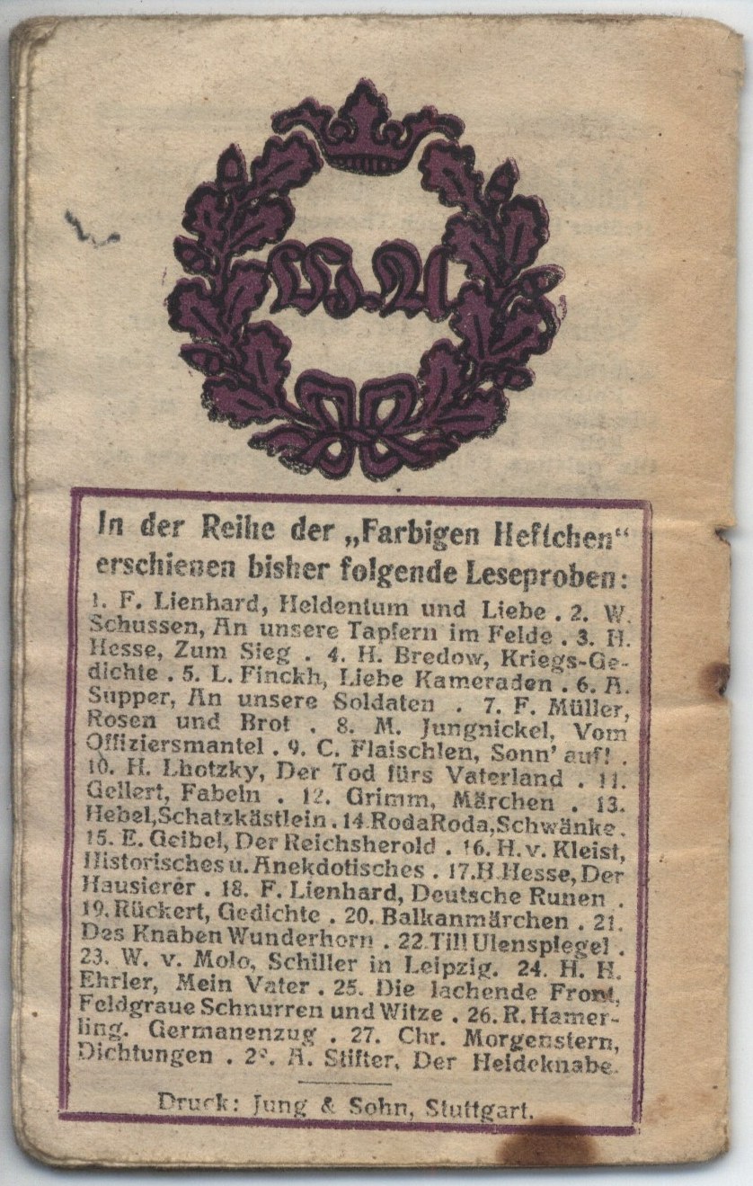 Farbigen HeftchenCountry Germany Language German Note Zdobená barevná přední strana. - Předmluva autora. - Text německy. - Týdenní kalendář od 1. 4. do 29. 3. - Dílo autora. - Ediční seznam a tiskárna na zadní straně brože.