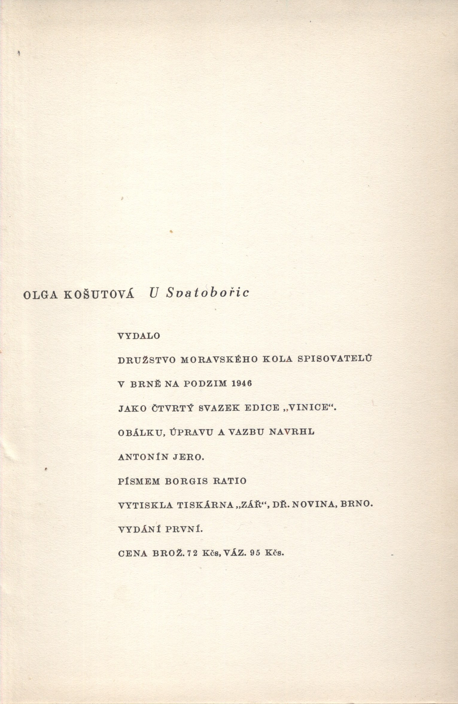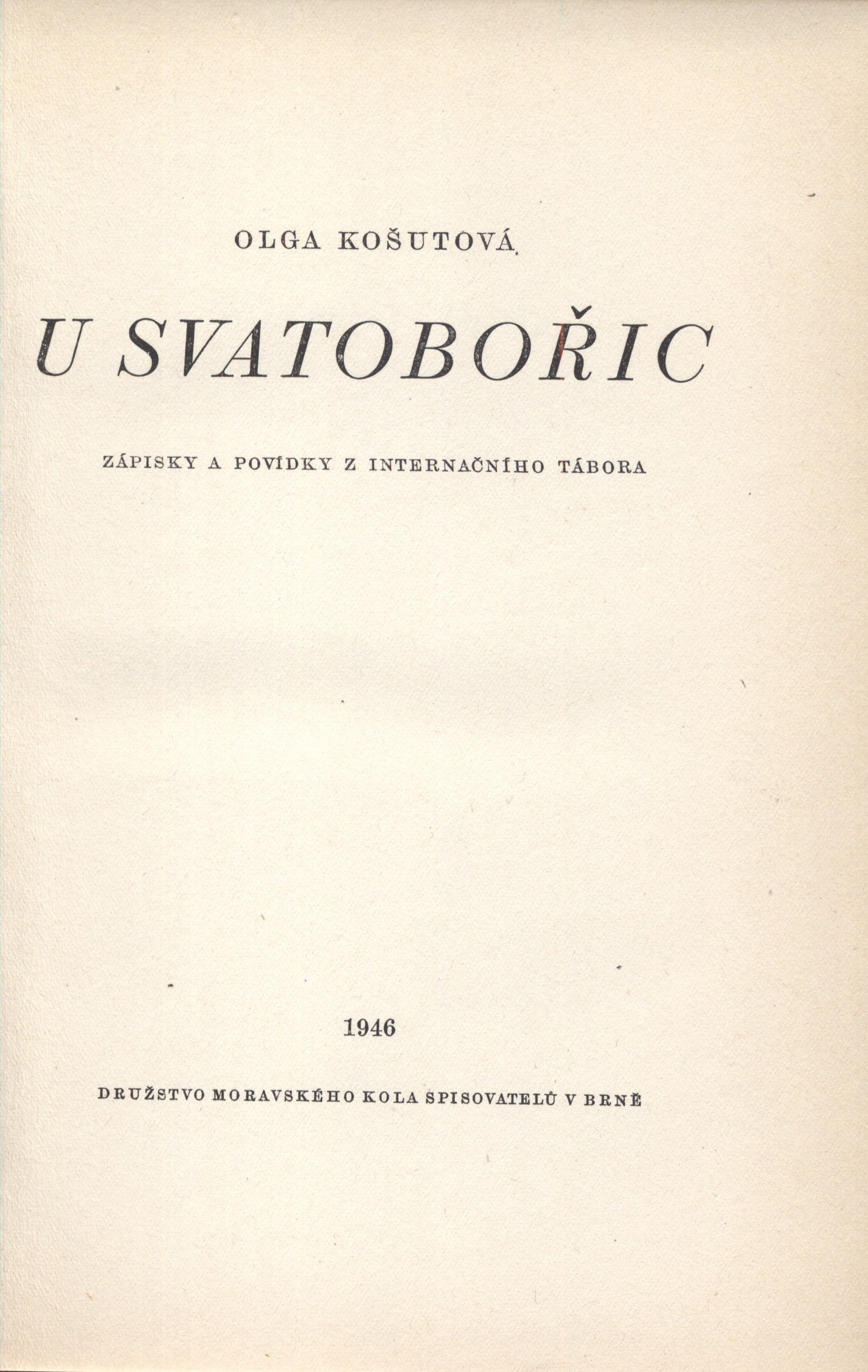 Title information U Svatobořic : zápisky a povídky z internačního tábora / Olga Košutová ; obálku, úpravu a vazbu navrhl Antonín Jero Personal name Košutová, Olga, 1901-1989 (Author) Další autoři Jero, Antonín, 1907-1981 (Bookjacket designer) (Book designer) Corporation Družstvo Moravského kola spisovatelů (nakladatelství) (Publisher) Zář (Brno, Česko) (Printer) Další var.názvy Zápisky a povídky z internačního tábora Edition statement Vydání první Publication V Brně : Družstvo Moravského kola spisovatelů, 1946 Manufacture Brno : Tiskárna Zář, dř. Novina Scope 234 stran ; 21 cm ISBN (Vázáno) Edition Vinice ; čtvrtý svazek