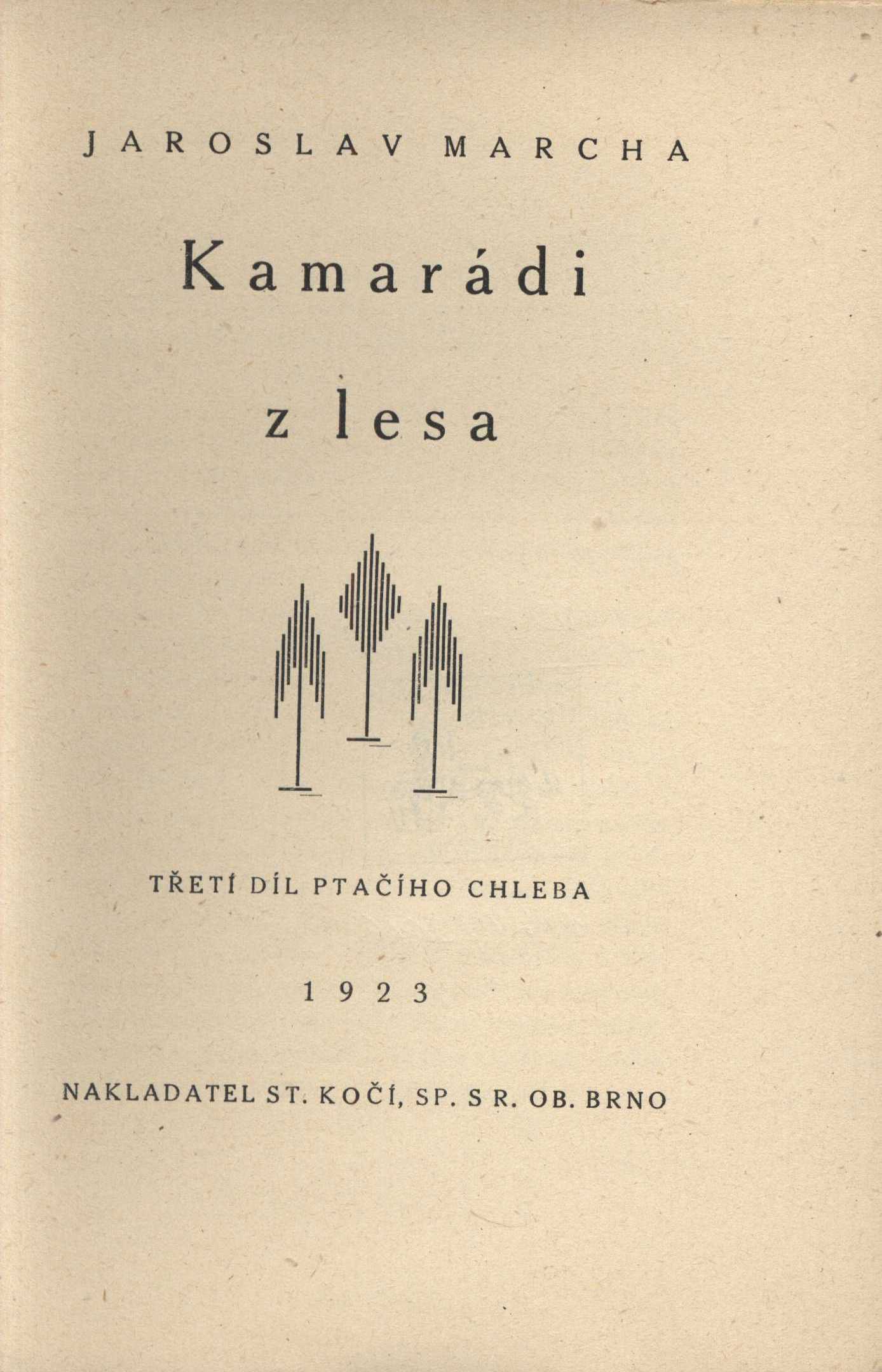 Title information Kamarádi z lesa : třetí díl Ptačího chleba / Jaroslav Marcha Personal name Marcha, Jaroslav, 1880-1961 (Author) (Dedicator) Další autoři St. Kočí (Brno) (Publisher) (Dedicatee) František Obzina (tiskárna, nakladatelství) (Printer of plates) Publication Brno : St. Kočí, 1923 Brno : Nakladatel St. Kočí, 1923 Manufacture Ve Vyškově : Vytiskl F. Obzina Scope 229 stran ; 19 cm ISBN (brožováno) Edition Zajímavá knihovna ; svazek 9