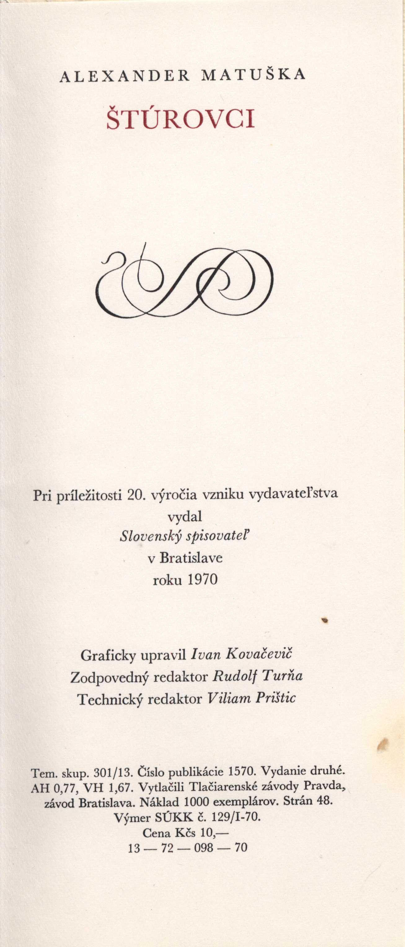 Title information Štúrovci / Alexander Matuška ; graficky upravil Ivan Kovačevič Personal name Matuška, Alexander, 1910-1975 (Author) Další autoři Kovačevič, Ivan Július, 1909-1979 (Book designer) Corporation Slovenský spisovateľ (nakladatelství) (Publisher) Edition statement Vydánie druhé Publication V Bratislave : Slovenský spisovateľ, 1970 Manufacture Tlačiarenské závody Pravda Scope 43 stran : 26,5 cm ISBN (Volné dvoulisty) Country Slovakia Language Slovak Note Vydáno při příležitosti 20. výročí vzniku vydavatelství.