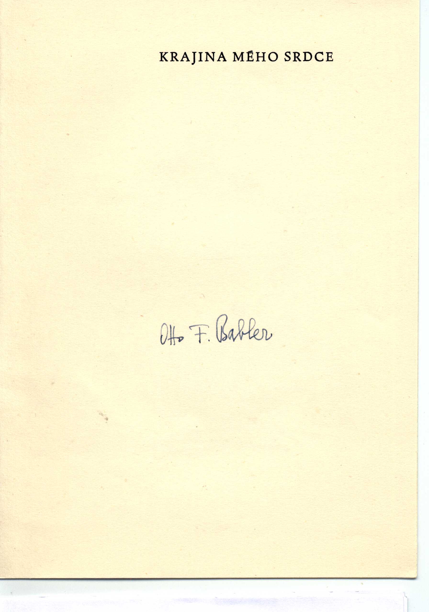 Title information Krajina mého srdce / Otto F. Babler ; kresby zasloužilý umělec Bohumír Dvorský Personal name Babler, Otto František, 1901-1984 (Author) (Inscriber) Další autoři Dvorský, Bohumír, 1902-1976 (Illustrator) (Inscriber) Corporation Spolek českých bibliofilů v Praze (Publisher) Moravské tiskařské závody (firma) (Printer) Publication V Praze : Spolek českých bibliofilů, 1971 Manufacture Olomouc ; v Moravských tiskařských závodech, provoz 12 Scope 19 stran : ilustrace ; 21 cm Country Czech Republic Language Czech Note Zelený tisk na obálce s kresbou. - Frontispis. - Černý a zelený tisk. - Volné listy v obálce. - 300 výt. - Bibliofilie.
