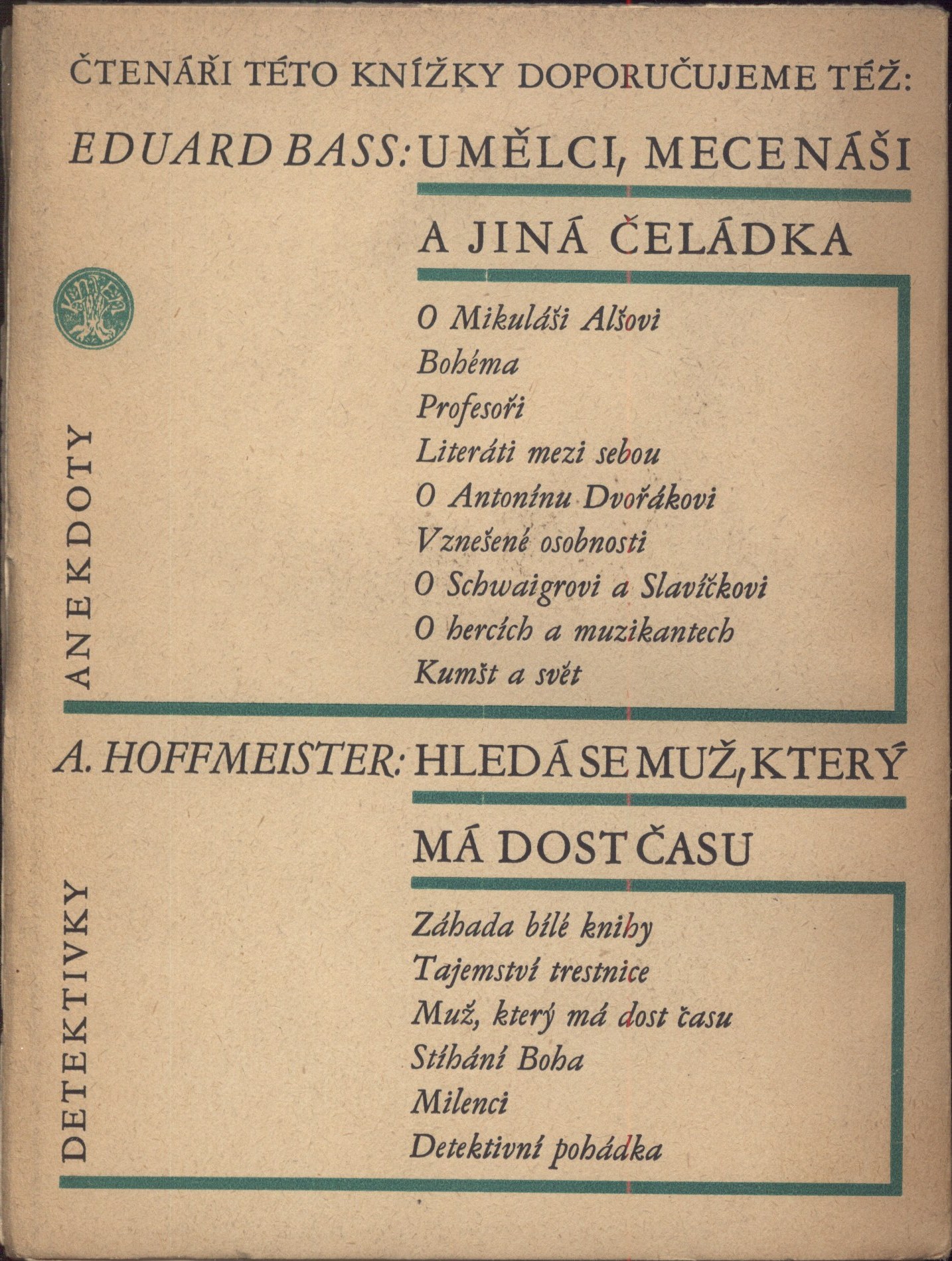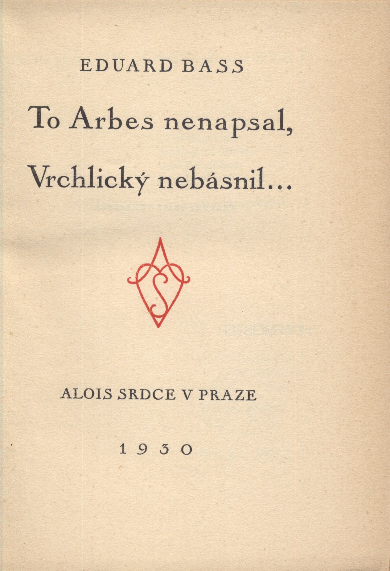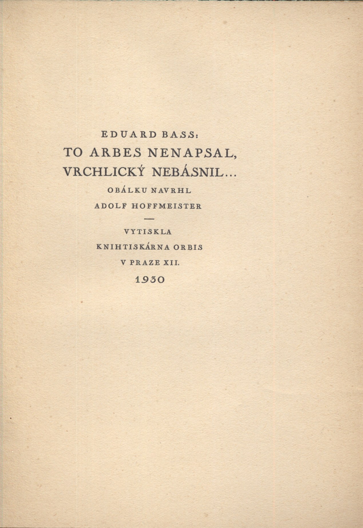 Title information To Arbes nenapsal, Vrchlický nebásnil... / Eduard Bass ; obálku navrhl Adolf Hoffmeister Personal name Bass, Eduard, 1888-1946 (Author) Další autoři Hoffmeister, Adolf, 1902-1973 (Bookjacket designer) Corporation Alois Srdce (nakladatelství) (Publisher) Orbis (tiskárna) (Printer) Publication V Praze : Alois Srdce 1930 Manufacture V Praze : knihtiskárna Orbis Scope 111 stran ; 16 cm ISBN (Brožováno) Country Czech Republic Language Czech Note Obálka s ilustrací. - Titulní list. - Obsah. - Tiráž. - Na zadní straně obálky upoutávky na jiná díla autora, značka Kmene