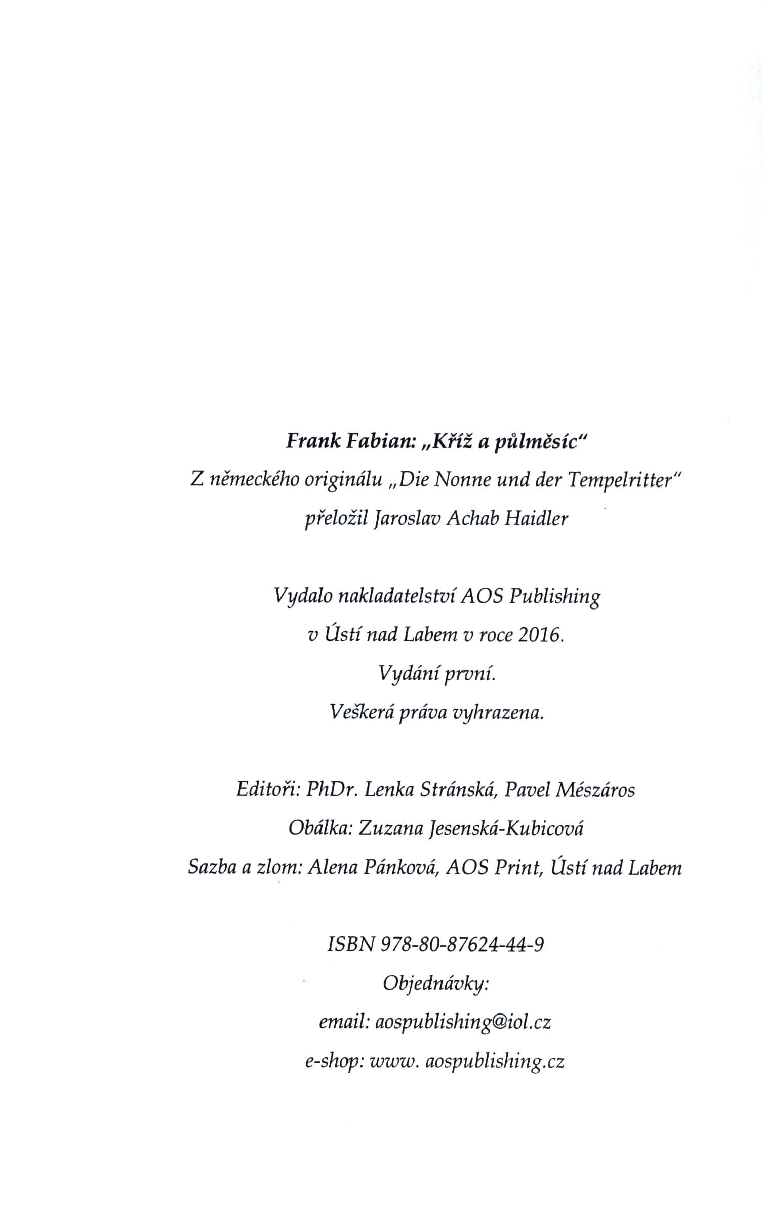 Title information Kříž a půlměsíc / Frank Fabian ; z německého originálu Die Nonne und der Tempelritter přeložil Jaroslav Achab Haidler ; editoři: Lenka Stránská, Pavel Mészáros ; obálka: Zuzka Jesenská-Kubicová Personal name Fabian, Frank, 1952- (Author) (Author of afterword, colophon, etc.) Uniform title Nonne und der Tempelritter. Česky Další autoři Haidler, Jaroslav Achab, 1958- (Translator) Stránská, Lenka, 1967- (Editor) Mészáros, Pavel, 1966- (Editor) Kubicová, Zuzana, 1979- (Bookjacket designer) Corporation AOS Publishing (nakladatelství) (Publisher) Edition statement Vydání první Publication V Ústí nad Labem : AOS Publishing, 2016 Manufacture Ústí nad Labem : Alena Pánková, AOS Print Scope 261 stran ; 21 cm ISBN 978-80-87624-44-9 (brožováno) Country Czech Republic Language Czech Language of the original German Note Obálkový podnázev: poslední tajemství templářů. - Barevná obálka s barevnou ilustrací a s dvoubarevným textem. - Copyrighty na místě frontispisu. - Prolog. - Doslov: Pravda a fikce od autora. - Upoutávky na další autorovy knihy. - Ukázky z textu a nakladatelská značka na zadní straně obálky.