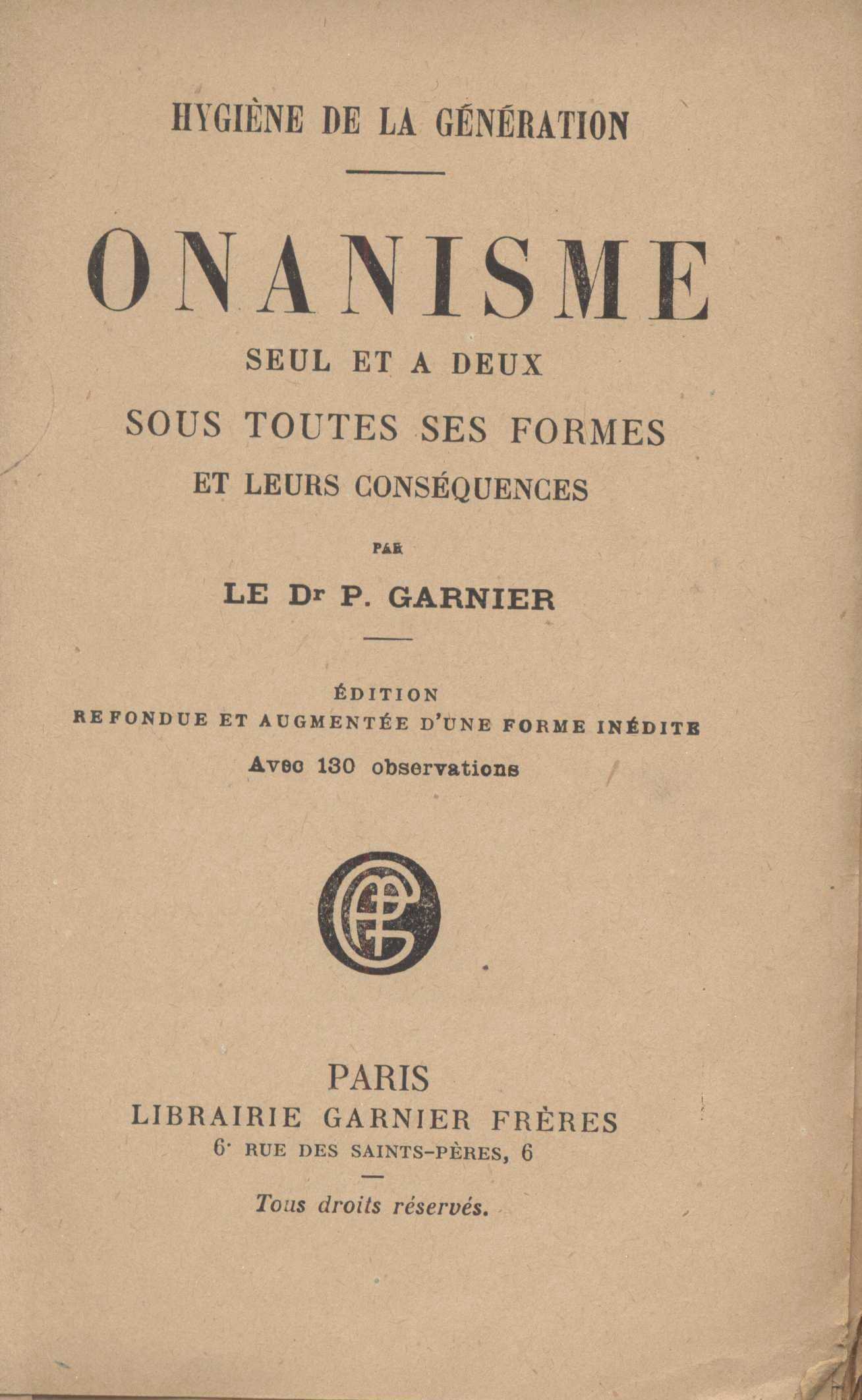 Title information Onanisme seul et à deux sous toutes ses formes et leurs conséquences / par le Dr P. Garnier Personal name Garnier, Pierre, 1819-asi 1901 (Author) Další autoři Garnier frères (Publisher) Edition statement Édition refondue et augmentée d'une forme inédite, avec 130 observations Publication Paris : Librairie Garnier frères, [1894] Manufacture Lutetia Scope 591 stran ; 19 cm ISBN (Brožováno) Edition Hygiène de la génération