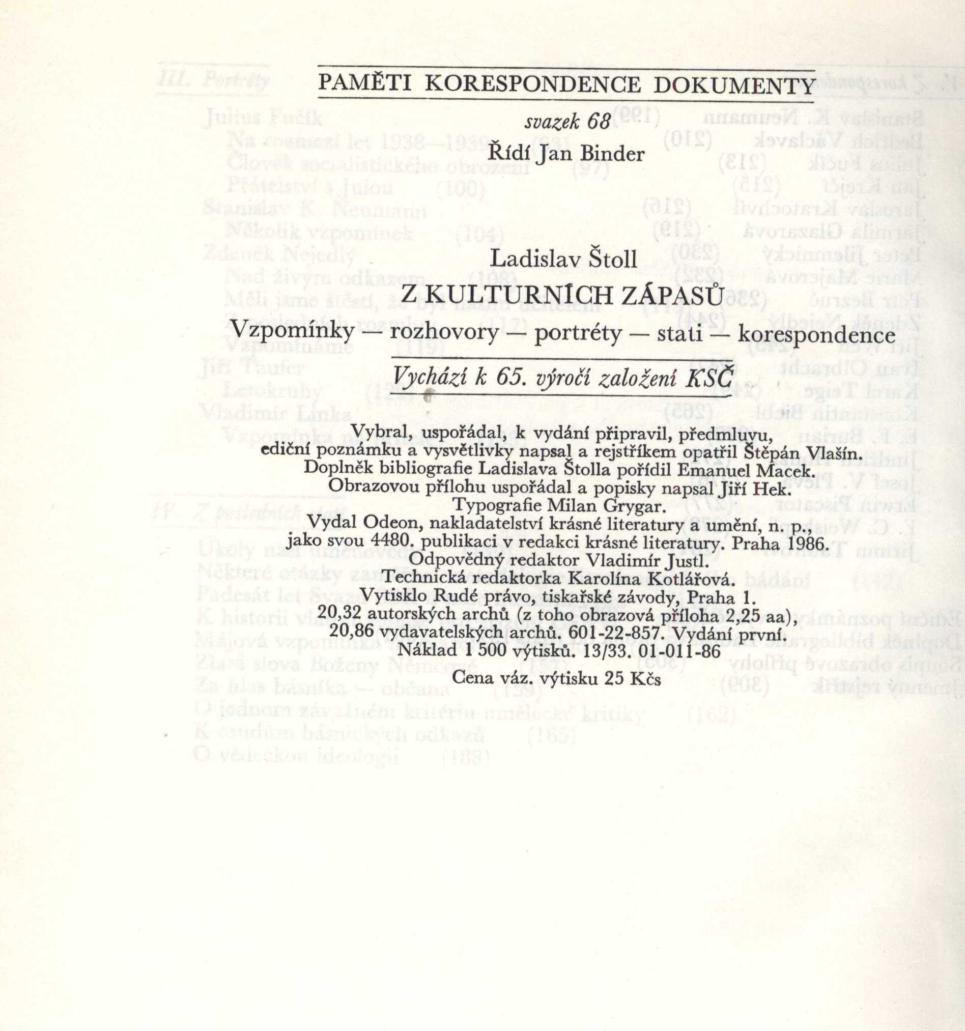Title information Z kulturních zápasů : vzpomínky - rozhovory - portréty - stati - korespondence / Ladislav Štoll ; vybral, uspořádal, k vydání připravil, předmluvu, ediční poznámku a vysvětlivky napsal a rejstříkem opatřil Štěpán Vlašín ; obrazovou přílohu uspořádal a popisky opatřil Jiří Hek Personal name Štoll, Ladislav, 1902-1981 (Author) Další autoři Vlašín, Štěpán, 1923-2012 (Editor) (Compiler) (Author of introduction) Hek, Jiří, 1932-1998 (Writer of accompanying material) Corporation Odeon (nakladatelství) (Publisher) Rudé právo (tiskárna, Praha) (Printer) Edition statement Vydání první Publication Praha : Odeon, 1986 Manufacture Rudé právo Scope 315 stran, 32 nečíslovaných stran obrazových příloh ; 22 cm ISBN (Vázáno) Edition Paměti, korespondence, dokumenty svazek 68