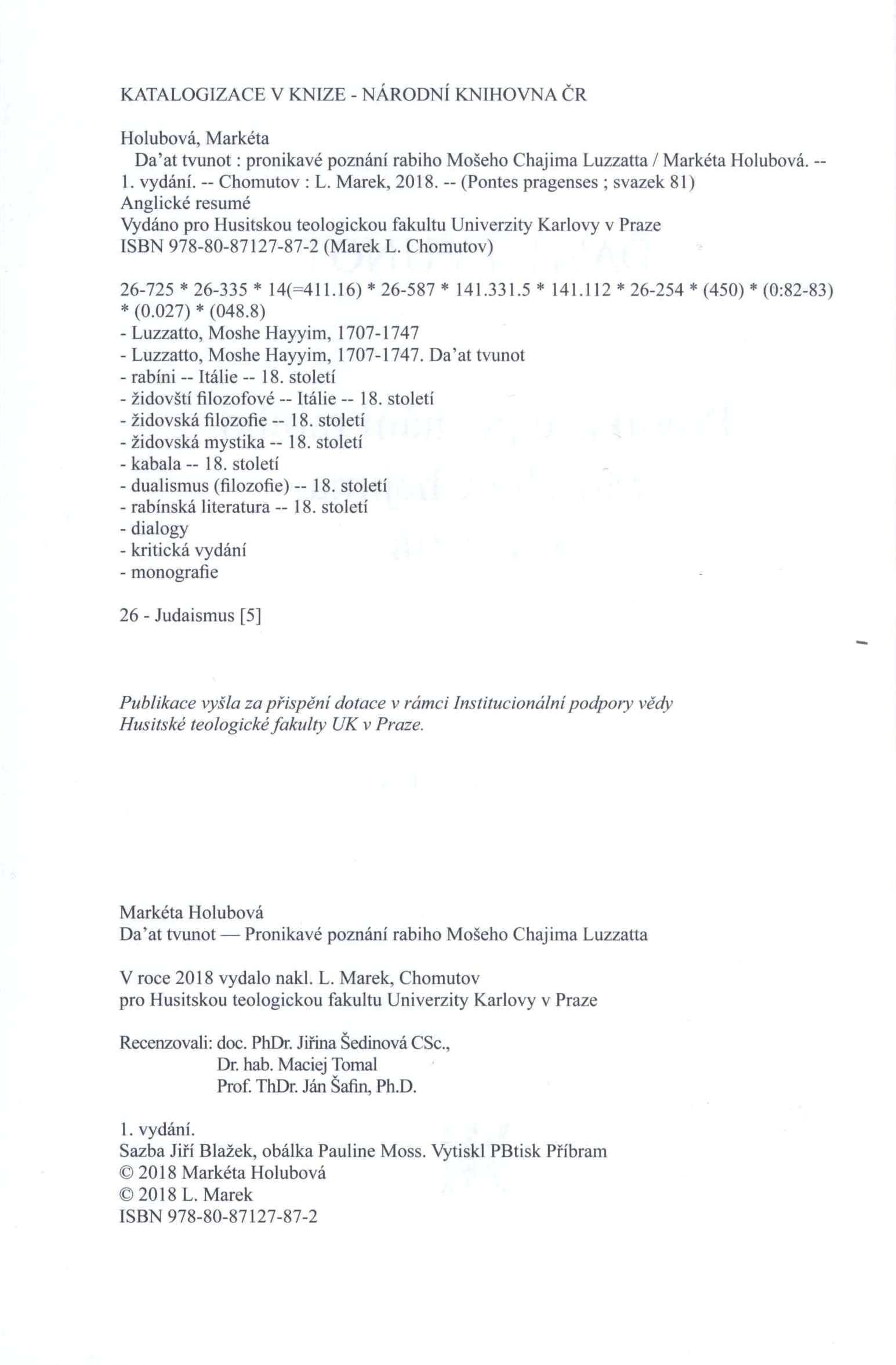 Title information Da'at tvunot : pronikavé poznání rabiho Mošeho Chajima Luzzatta / [úvodní text a překlad] Markéta Holubová ; obálka Pauline Moss Personal name Luzato, Moše Chajim, 1707-1747 (Author) Další autoři Holubová, Markéta, 1974- (Author of introduction) (Translator) Luzato, Moše Chajim, 1707-1747. Da'at tvunot Luzato, Moše Chajim, 1707-1747. Da'at tvunot. Česky Moss, Pauline (Bookjacket designer) Corporation Univerzita Karlova. Husitská teologická fakulta (Publisher) L. Marek (nakladatelství) (Publisher) PBtisk (tiskárna) (Printer) Edition statement 1. vydání Publication Chomutov : L. Marek pro Husitskou teologickou fakultu Univerzity Karlovy v Praze, 2018 Manufacture Příbram : PBtisk Scope 397 stran ; 22 cm ISBN 978-80-87127-87-2 (L. Marek ; vázáno) Edition Pontes pragenses ; svazek 81