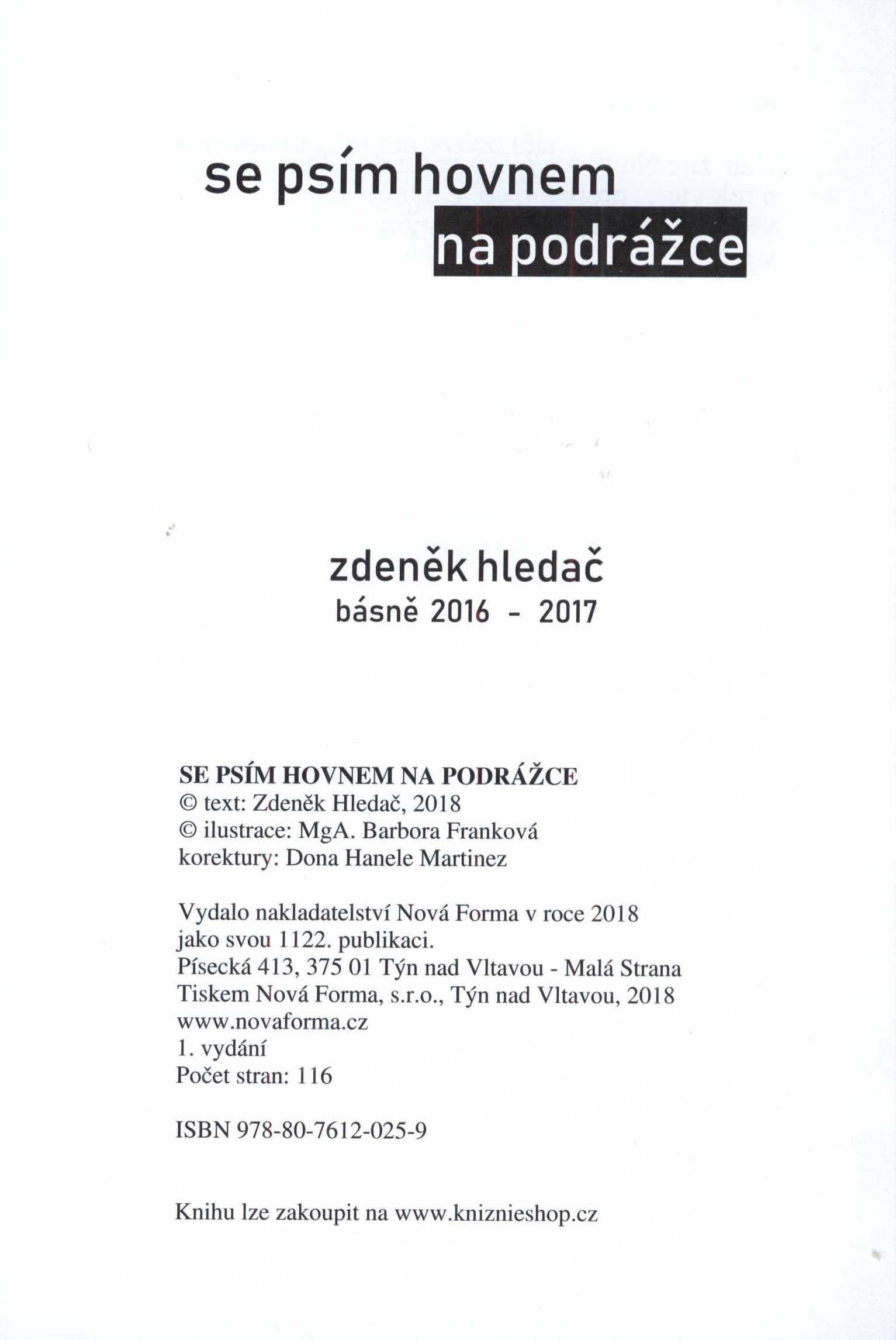 Title information Se psím hovnem na podrážce : básně 2016-2017 / Zdeněk Hledač Personal name Hledač, Zdeněk, 1965- (Author) Další autoři Franková, Barbora, 1979- (Illustrator) Corporation Nová Forma (firma) (Publisher) (Printer) Edition statement 1. vydání Publication Týn nad Vltavou : nakladatelství Nová Forma, 2018 Manufacture Tiskem Nová Forma, s.r.o. Scope 115 stran ; 21 cm ISBN 978-80-7612-025-9 (vázáno) Country Czech Republic Language Czech Note Ilustrace na obálce. - Na zadní straně obálky poznámka o autorovi.