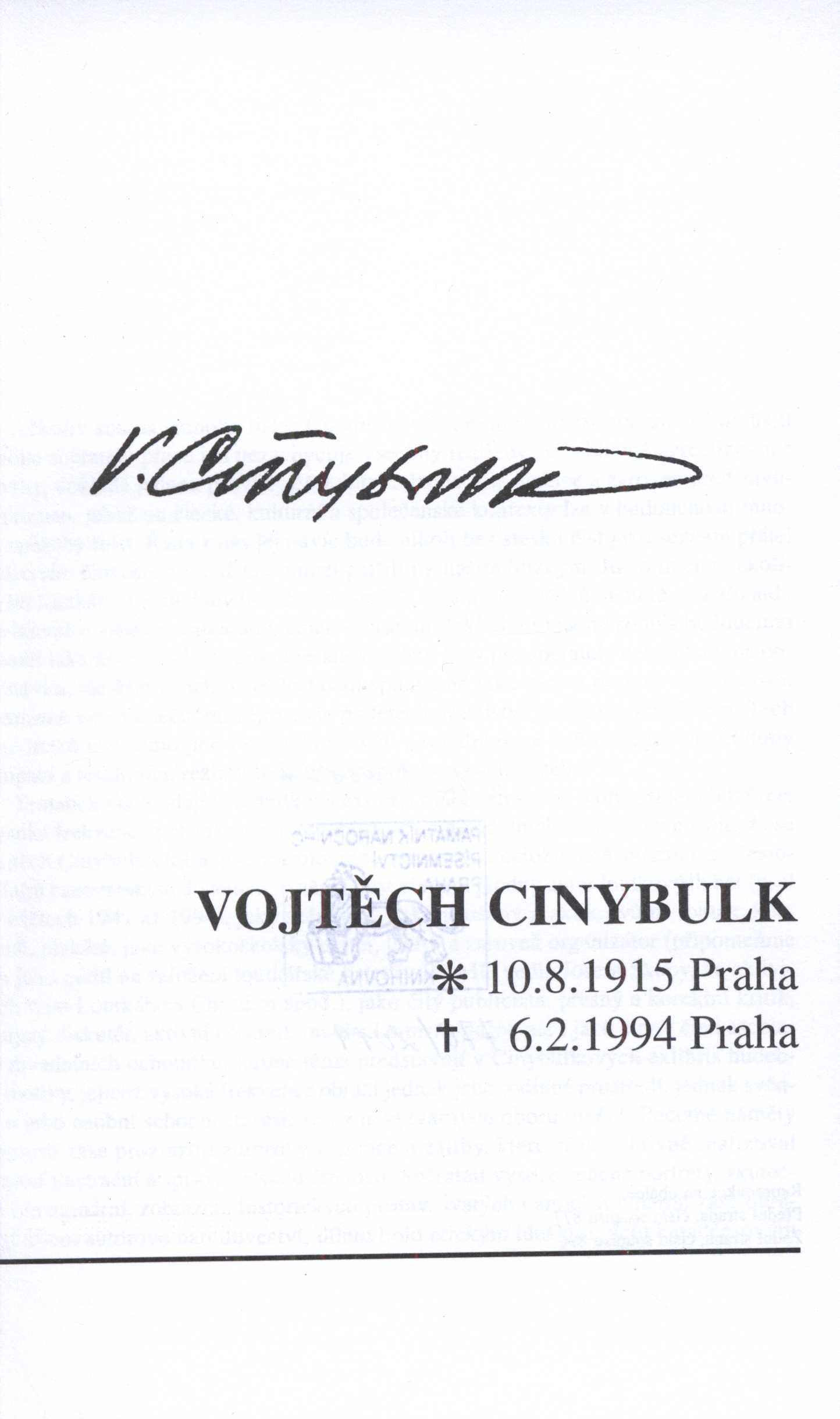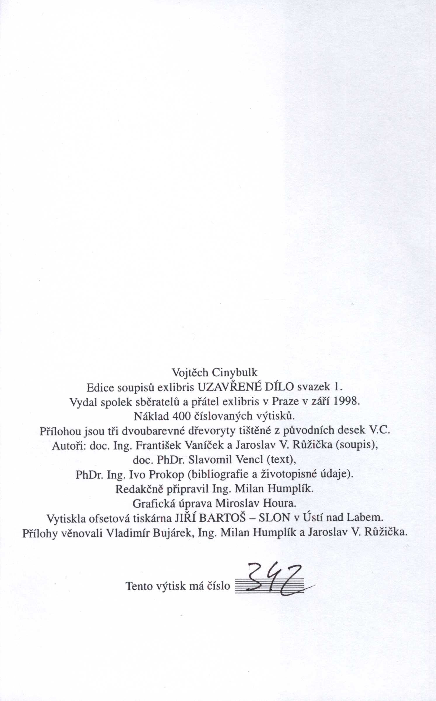 Note Brožovaná vazba s přebalem ze světle šedého papíru, na přední desce černý tisk exlibris (č. 877) a názvových údajů, na zadní černý tisk exlibris (č. 896). - Značka edice. - Frontispis (foto V. Cinybulka. - Černobílé reprodukce exlibris v textu. - Přílohou jsou tři barevné dřevoryty tištěné z původních desek V.C., které věnovali Vladimír Bujárek, Milan Humplík a Jaroslav Růžička. - Náklad 400 číslovaných výtisků.
