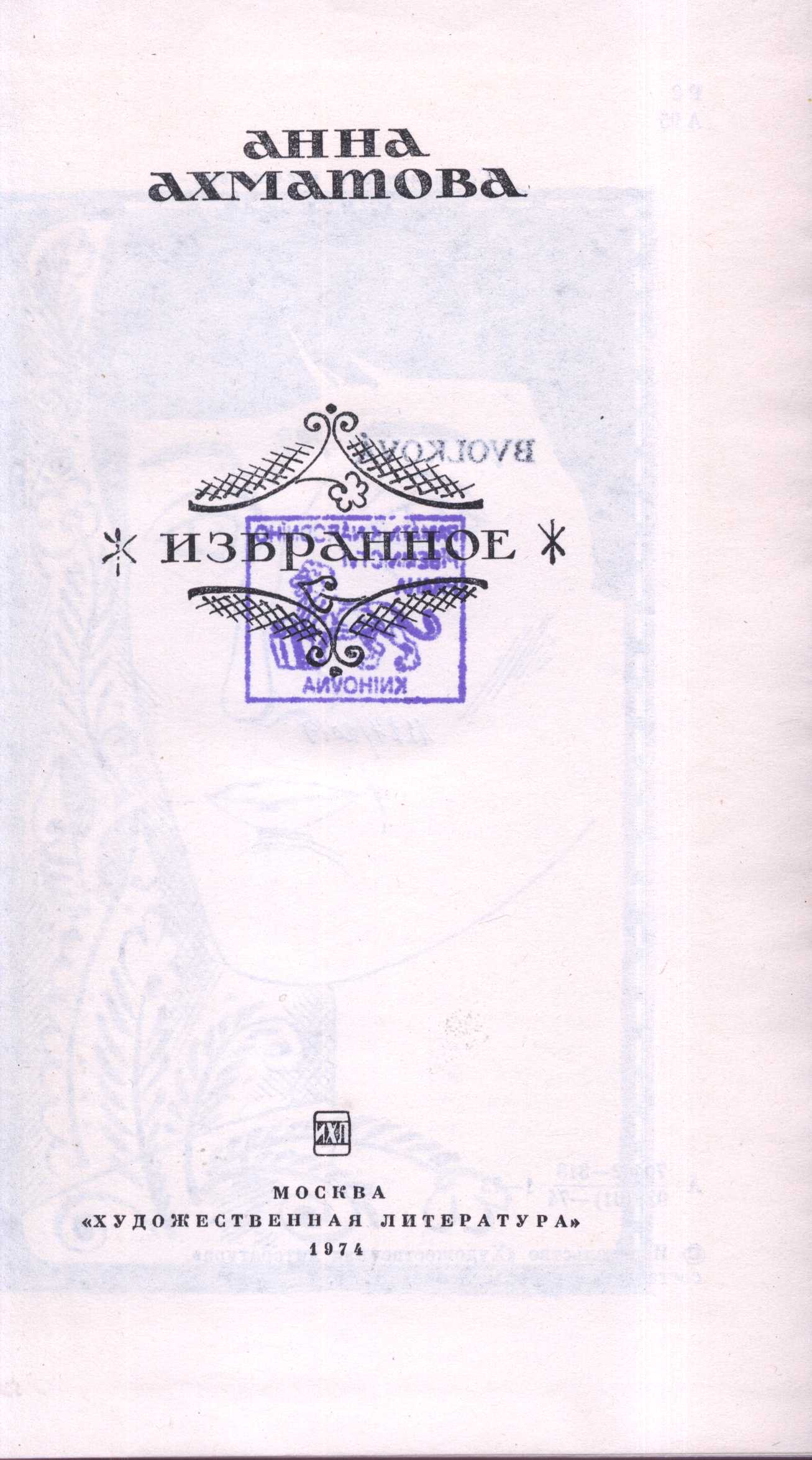 Title information Izbrannoje / Anna Achmatova ; sostavlenije i posleslovije N. Bannikova Personal name Achmatova, Anna Andrejevna, 1889-1966 (Author) Další autoři Chudožestvennaja literatura (nakladatelství) (Publisher) Publication Moskva : Chudožestvennaja literatura, 1974 Scope 589 stran ; ilustrace 21 cm ISBN (Vázáno) Country Russia (Federation) Language Russian Note Zdobená plátěná vazba. - Ilustrovaná přídeští a předsádky. - Černobílé ilustrace. - Doslov. - Rejstřík básní