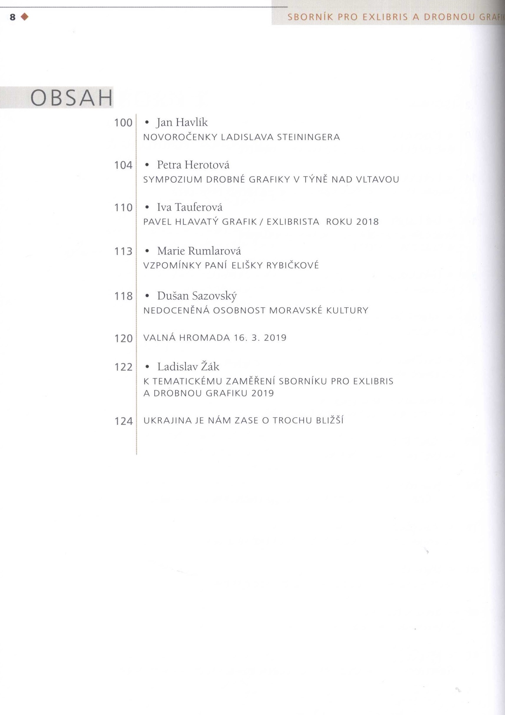 Title information Sborník pro exlibris a drobnou grafiku Další autoři Laňková, Stanislava, 1960- (Bookjacket designer) Hraba, Zbyněk, 1960- (Illustrator) Corporation Spolek sběratelů a přátel exlibris (Publisher) Fastr typo-tisk (tiskárna) (Printer) Roč., číslo 2019 Publication Praha : Spolek sběratelů a přátel exlibris, 2019 Manufacture FASTR typo-tisk Scope 167 stran: ilustrace, fotografie, portréty, faksimile ; 22 cm ISBN 978-80-906980-8-6 (brožováno) Country Czech Republic Language Czech Note Zdobená obálka. - Rozložený titulní list. - Černobílé i barevné fotografie, portréty a ilustrace. - Faksimile. - 500 výtisků. - Vydáno u příležitosti stého výročí narození Oty Janečka