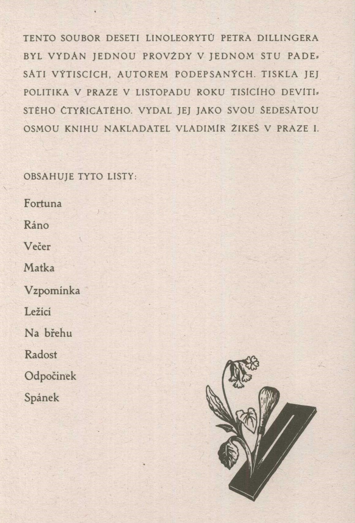 Note Světlá obálka s faksimile podpisu P.. Dillingera, logo Obecní galerie Beseda. - Na rubu přední strany obálky údaje tiráže. - Volně vložený dvoulist (titulní list s drobnou grafikou a nakladatelskou značkou Vladimíra Žikeše; drobné grafické motivy, text o souboru a o autorovi; nakladatelské údaje původního vydání z r. 1940, seznam listů). - Volně vložených deset černobílých pohlednic (reprodukce linoleorytu, faksimile podpisu autora; na zadní straně název díla a loga Obecní galerie beseda, eZra, Sdružení občanů a přátel Malé Strany a Hradčan). - Na zadní záložce stručná biografie autora, jeho značka. - Na zadní straně obálky loga sponzorů.