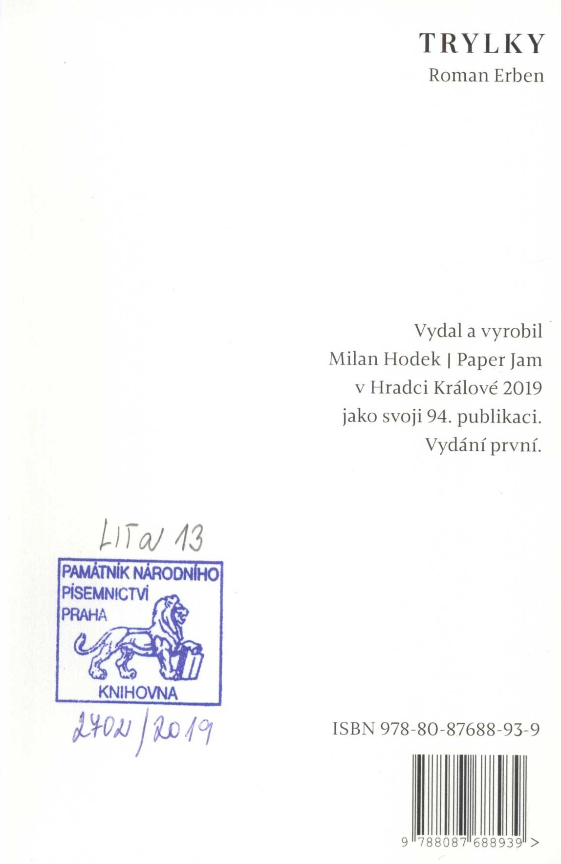 Title information Trylky / Roman Erben Personal name Erben, Roman, 1940- (Author) (Illustrator) Další autoři Milan Hodek (nakladatelství) (Publisher) Paper Jam (tiskárna) (Printer) Edition statement Vydání první Publication V Hradci Králové : Milan Hodek - Paper Jam, 2019 Scope 49 nečíslovaných listů : ilustrace ; 16 cm ISBN 978-80-87688-93-9 (vázáno) Country Czech Republic Language Czech Note Šedé kartonové desky, černý text, nakladatelská značka; kroužková vazba. - Černobílá ilustrace na titulním listu. - Na jednotlivých listech černobílé ilustrace a báseň. - Faksimile podpisu autora / 2000, 49 kreseb. - Tiráž.