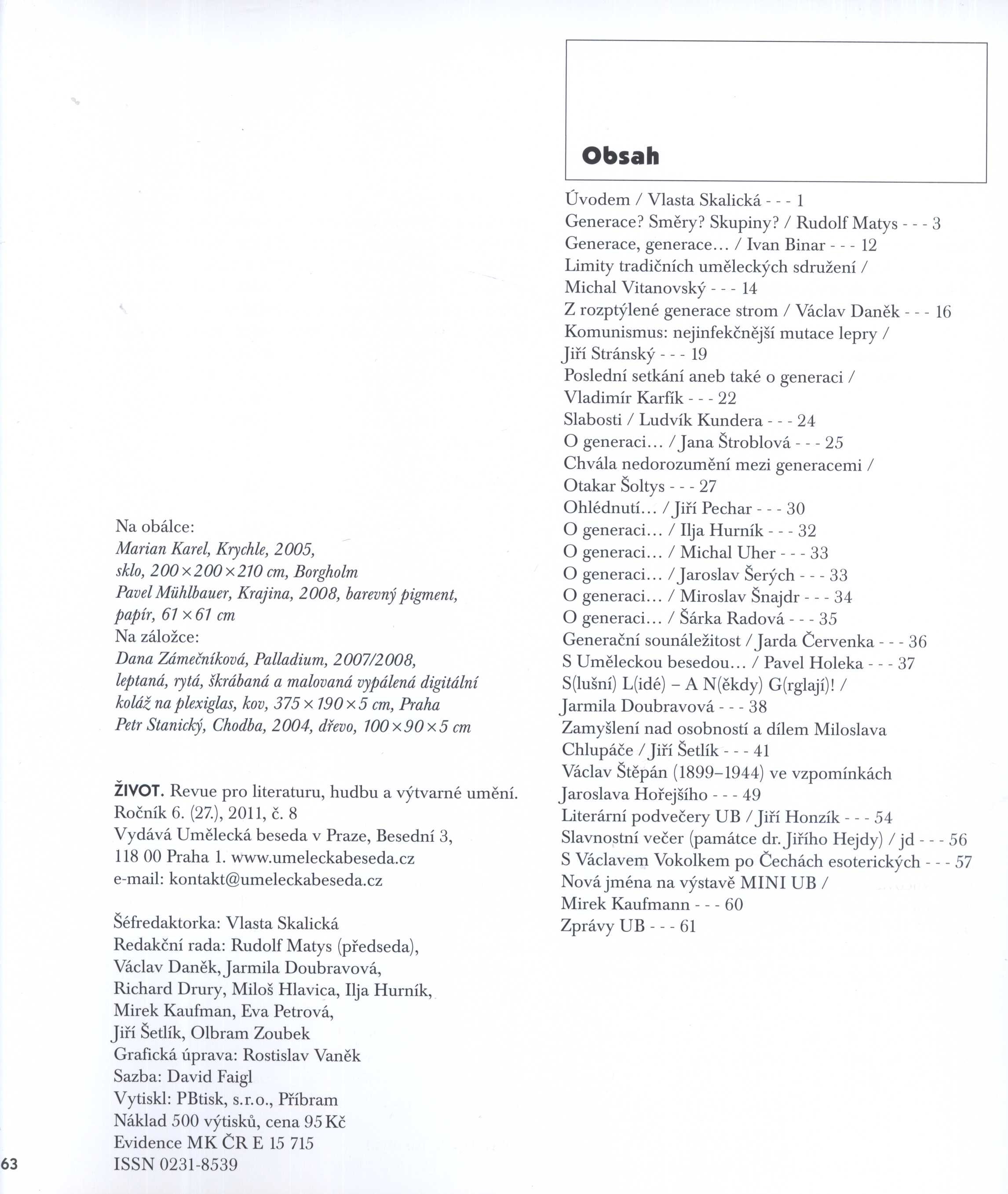 Title information Život : revue Umělecké besedy : revue pro literaturu, hudbu a výtvarné umění Další autoři Skalická, Vlasta, 1951- (Publishing director) Vaněk, Rostislav, 1945- (Book designer) Corporation PBtisk (tiskárna) (Printer) Roč., číslo Ročník 6(27), číslo 8, 2011 Další var.názvy Revue Umělecké besedy Publication V Praze : Umělecká beseda, 2011 Manufacture Příbram : PBtisk, s.r.o. Scope 63 stran, 8 nečíslovaných stran obrazových příloh : ilustrace, fotografie ; 23,5 cm ISSN 0231-8539 Country Czech Republic Language Czech Note Zdob. obálka. - Čb. ilustrace a fotografie v textu, barevné ilustrace v obrazové příloze. - 500 výtisků