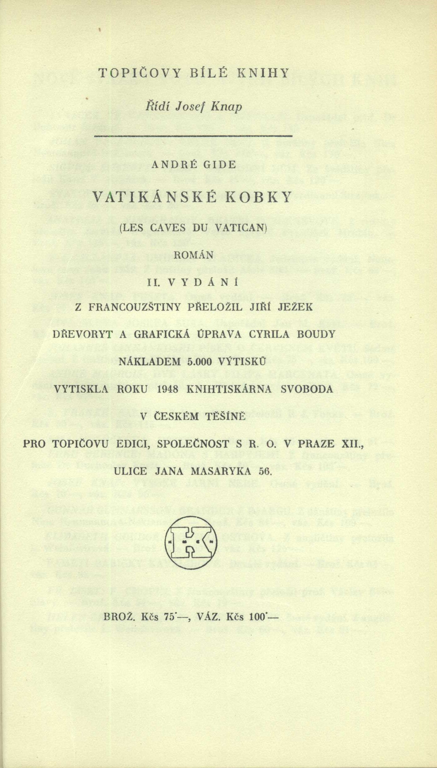 Title information Vatikánské kobky = (Les Caves du Vatican) : bláznivina / André Gide ; z francouzštiny přeložil Jiří Ježek Personal name Gide, André, 1869-1951 (Author) Další autoři Ježek, Jiří, 1901-1963 (Translator) Bouda, Cyril, 1901-1984 (Illustrator) (Book designer) Corporation Topičova edice (nakladatelství) (Publisher) Svoboda (Český Těšín) (Printer) (Printer of plates) Další var.názvy Bláznivina Edition statement Druhé vydání Publication Praha : Topičova edice, 1948 Manufacture V Českém Těšíně : knihtiskárna Svoboda Scope 220 stran ; 22 cm ISBN (Vázáno) Edition Topičovy Bílé knihy : zrcadlo literárního světa