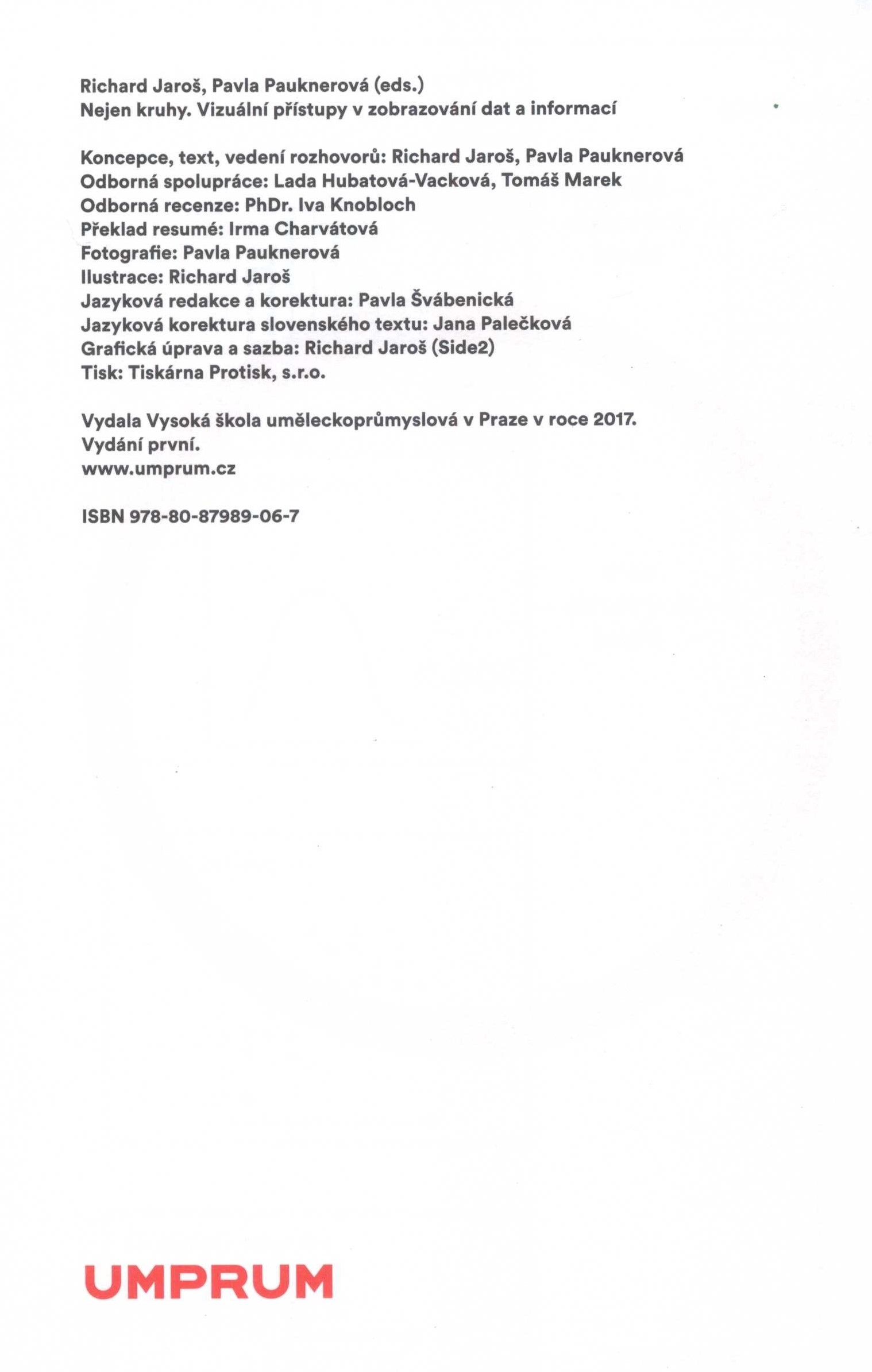 Title information Nejen kruhy : vizuální přístupy v zobrazování dat a informací / Richard Jaroš, Pavla Pauknerová (eds.) ; fotografie: Pavla Pauknerová ; ilustrace: Richard Jaroš ; grafická úprava a sazba: Richard Jaroš (Side2) Další autoři Jaroš, Richard, 1989- (Editor) (Conceptor) (Interviewer) (Illustrator) (Book designer) (Compositor) Pauknerová, Pavla, (Editor) (Conceptor) (Interviewer) (Photographer) 1984- Corporation Vysoká škola uměleckoprůmyslová (vydavatelství) (Publisher) Protisk (tiskárna, České Budějovice) (Printer) Edition statement Vydání první Publication V Praze : Vysoká škola uměleckoprůmyslová, 2017 Manufacture [České Budějovice] : Tiskárna Protisk, s.r.o. Scope 165 stran : ilustrace (některé barevné), mapy, plány, faksimile ; 22 cm + 1 plakát ISBN 978-80-87989-06-7 (brožováno) Country Czech Republic Language Czech Note Světlá, graficky zdobená, obálka, černý text. - Červená vazba, černé ilustrace, černý text. - Citace (L. Caroll, T. S. Eliot). - Obsah. - Úvod editorů. - Texty. - Černnobílé a barevné ilustrace, fotografie, mapy, plány, faksimile s popisky. - Rozhovory. - Anotace na zadní straně obálky. - Složený plakát tvoří přebal brožury. -