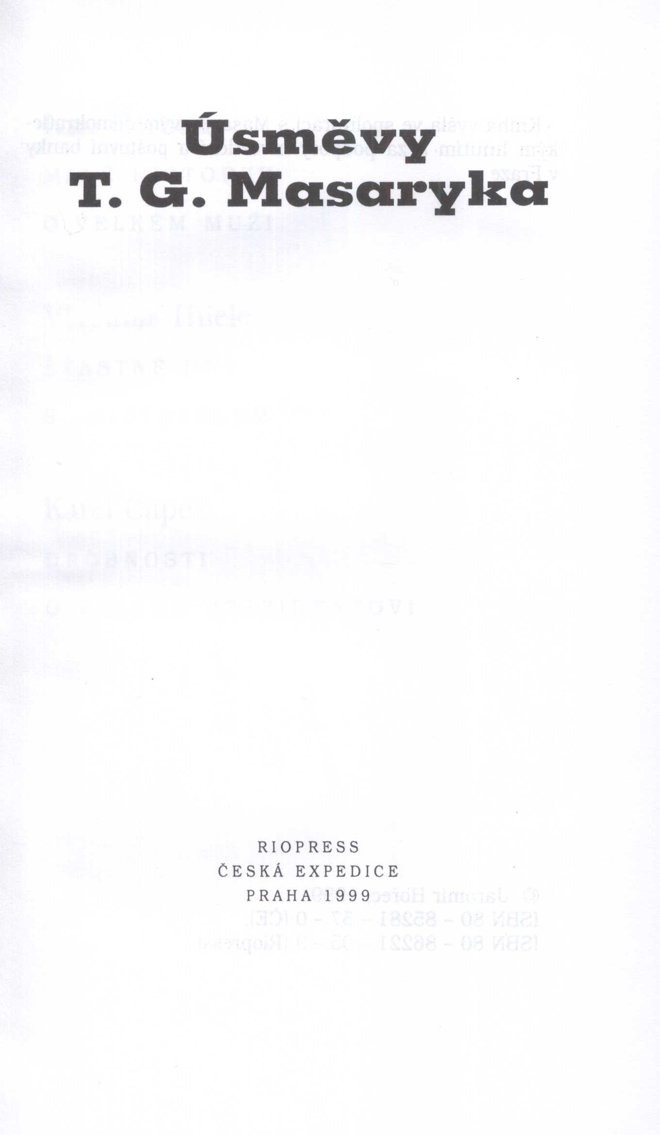 Title information Úsměvy T. G. Masaryka / uspořádal Jaromír Hořec ; grafická úprava a návrh vazby Miroslav Klomínek Personal name Hořejš, Jaromír, 1903-1961 (Compiler) (Commentator) Další autoři Klomínek, Miroslav, 1931- (Book designer) (Binder) Corporation Riopress (nakladatelství) (Publisher) Česká expedice (vydavatelství) (Publisher) Masarykovo demokratické hnutí (sdružení) (Other) Příbramská tiskárna s.r.o. (Printer) Edition statement V tomto uspořádání první vydání Publication Praha : Riopress : Česká expedice, 1999 Manufacture Příbram : Příbramská tiskárna s.r.o. Scope 143 stran, 16 stran obrazové přílohy : ilustrace, fotografie, faksimile ; 21 cm ISBN 80-85281-57-0 (ČE ; vázáno) 80-86221-05-9 (Riopress ; vázáno) Edition Hlas ; svazek 9