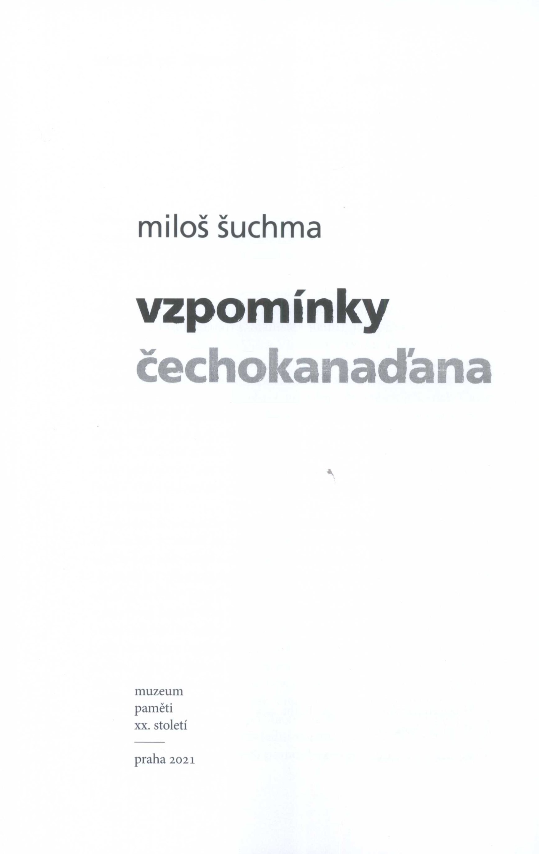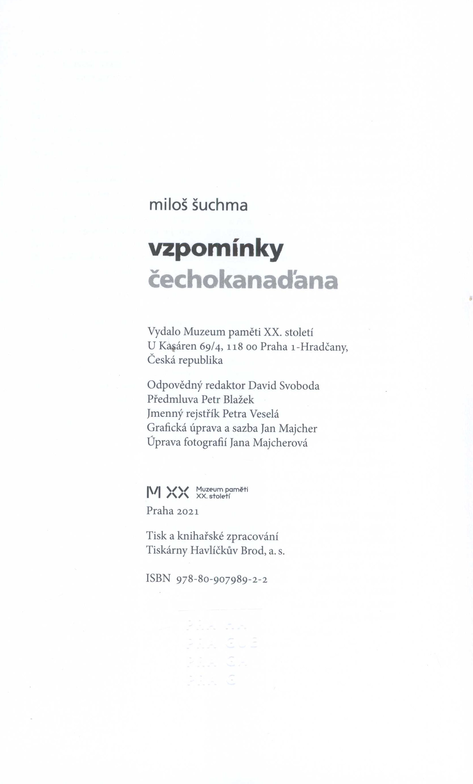 Title information Vzpomínky čechokanaďana / Miloš Šuchma ; předmluva Petr Blažek ; grafická úprava a sazba Jan Majcher Personal name Šuchma, Miloš, 1940- (Author) Další autoři Blažek, Petr, 1973- (Author of introduction) Majcher, Jan, 1959- (Book designer) (Compositor) Corporation Muzeum paměti XX. století (Praha, Česko) (Publisher) Tiskárny Havlíčkův Brod (firma) (Printer) Publication Praha : Muzeum paměti XX. století, 2021 Manufacture Havlíčkův Brod : Tiskárny Havlíčkův Brod, a.s. Scope 447 stran : ilustrace, portréty ; 24 cm ISBN 978-80-907989-2-2 (brožováno) Country Czech Republic Language Czech Note Tříbarevná zdobená vazba, černobílá fotografie autora, dvoubarevný text; hnědý hřbet s dvoubarevným textem. - Logo muzea. - Patitul. - Předmluva "Tenkrát na Západě" P. Blažek. - Obsah. - Úvod. - Jednotlivé kapitoly (na úvod barevný list s bílým textem, občas s citací). - Černobílé fotografie, portréty, ilustrace s popisky. - Vybrané články a rozhovory. - Na zadní záložce text J. Kalouse. - Anotace knihy na zadní straně obálky.