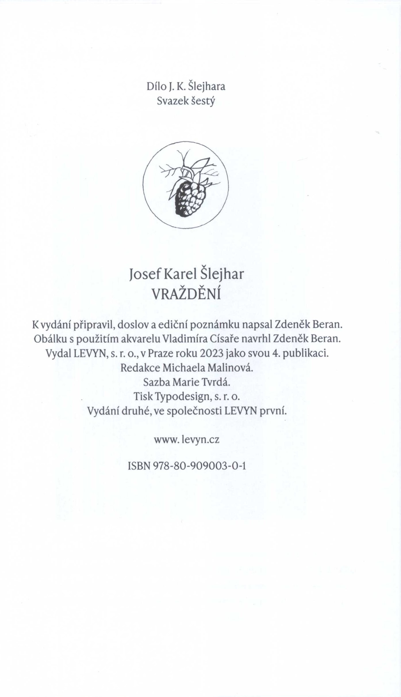 Title information Vraždění / Josef Karel Šlejhar ; k vydání připravil, doslov a ediční poznámku napsal Zdeněk Beran ; ilustrace na obálce Vladimír Císař Personal name Šlejhar, Josef Karel, 1864-1914 (Author) Další autoři Beran, Zdeněk, 1959- (Editor) (Author of afterword, colophon, etc.) (Commentator) (Bookjacket designer) Císař, Vladimír, 1960- (Bookjacket designer) (Artist) Corporation LEVYN (firma) (Publisher) Typodesign (firma) (Printer) Edition statement Vydání druhé, ve společnosti Levyn první Publication V Praze : Levyn, 2023 Manufacture [České Budějovice] : Typodesign, s.r.o. Scope 307 stran ; 22 cm ISBN 978-80-909003-0-1 (vázáno) Edition Dílo J.K. Šlejhara ; svazek 6.