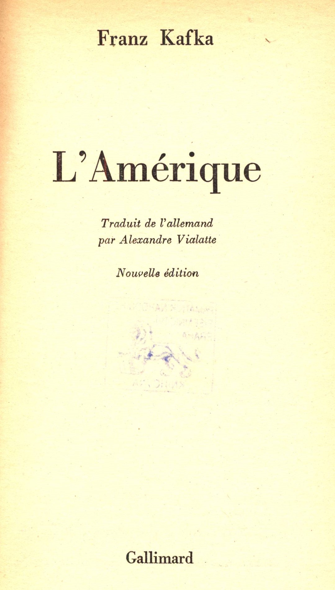 Title information L'Amérique / Franz Kafka ; traduit de l'allemand par Alexandre Vialatte Personal name Kafka, Franz, 1883-1924 (Author) Další autoři Vialatte, Alexandre, 1901-1971 (Translator) Corporation Gallimard (firma) (Publisher) Bussière (firma) (Printer) Edition statement Nouvelle édition Publication [Paris] : Gallimard, 1979 Manufacture Saint-Amand (Cher) : l´Imprimerie Bussière Copyright notice date ©1965 Scope 367 stran ; 18 cm ISBN (Brožováno) Edition Collection Folio, (Gallimard) 803