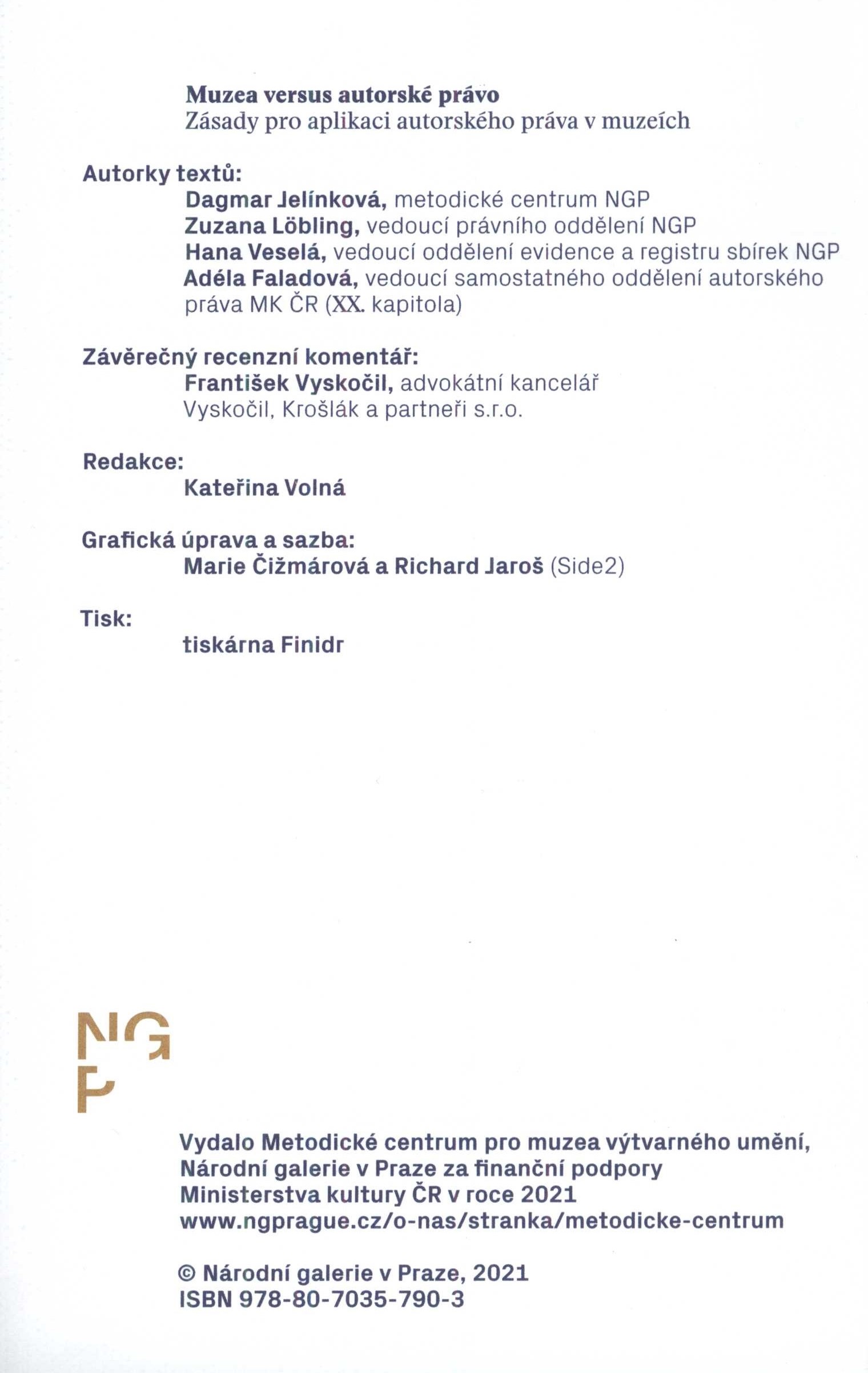 Title information Muzea versus autorské právo : zásady pro aplikaci autorského práva v muzeích / Dagmar Jelínková, Zuzana Löbling, Hana Veselá ; grafická úprava a sazba Marie Čižmárová a Richard Jaroš (Side2) Personal name Jelínková, Dagmar, 1961- (Author) (Author of introduction) Další autoři Löbling, Zuzana (Author) (Author of introduction) Veselá, Hanina, 1981- (Author) (Author of introduction) Čižmárová, Marie, 1994- (Book designer) (Compositor) Jaroš, Richard, 1989- (Book designer) (Compositor) Corporation Národní galerie (Praha, Česko). Metodické centrum pro muzea výtvarného umění (Publisher) Finidr (tiskárna) (Printer) Publication [Praha] : Metodické centrum pro muzea výtvarného umění, Národní galerie v Praze, 2021 Manufacture Finidr Scope 87 stran ; 21 cm ISBN 978-80-7035-790-3 (Národní galerie v Praze ; brožováno) Country Czech Republic Language Czech Note Barevná typografická obálka. - Úvodní slovo autorek. - Obsah.