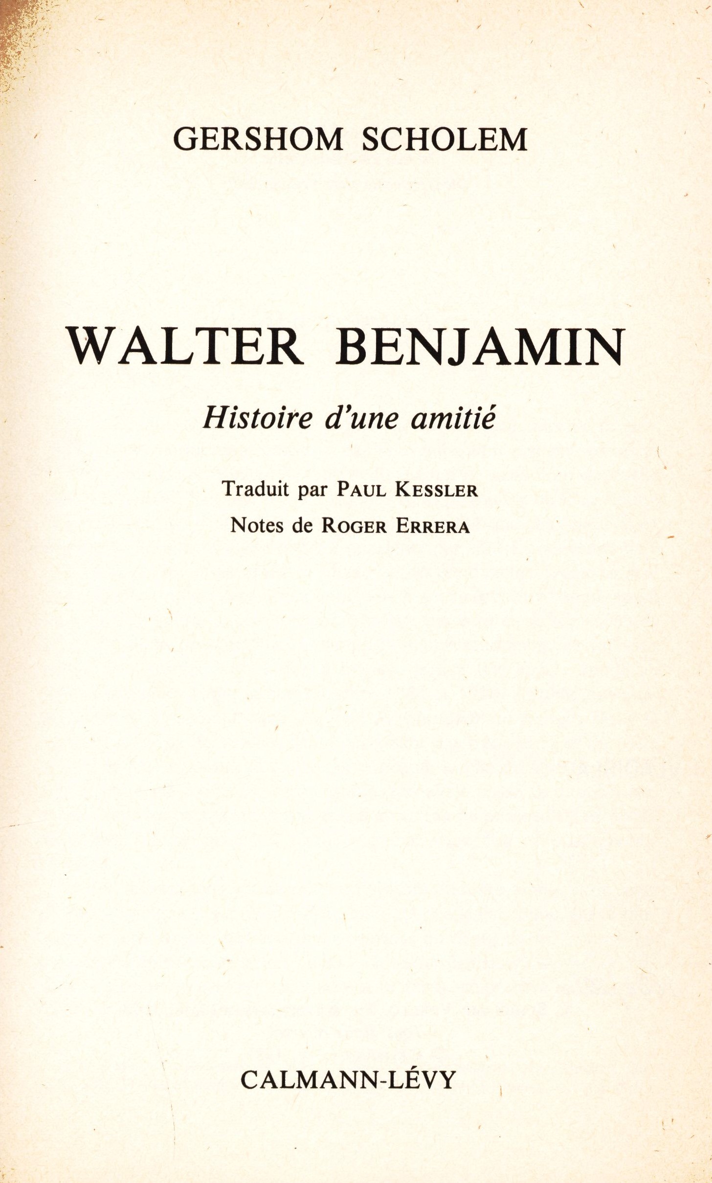Title information Walter Benjamin : Historie d'une amitié / Gershom Scholem ; Traduit par Paul Kessler ; Notes de Roger Errera Personal name Scholem, Gershom Gerhard, 1897-1982 (Author) Další autoři Kessler, Paul (Translator) Errera, Roger, 1933-2014 (Editor) Corporation Calmann-Lévy (firma) (Publisher) Floch (francouzská tiskárna) (Printer) Publication Paris : Calmann-Lévy, 1981 Manufacture Mayenne : Floch Scope 262 stran ; 21 cm ISBN 2-7021-0388-X (brožováno) Edition Collection Diaspora