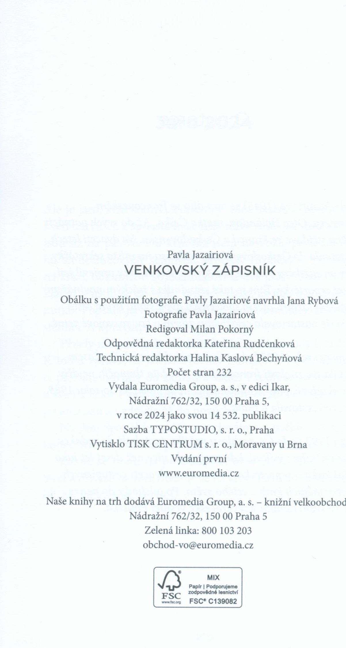 Názvové údaje Venkovský zápisník / Pavla Jazairiová ; obálku s použitím fotografie Pavly Jazairové navrhla Jana Rybová ; fotografie Pavla Jazairová Osobní jméno Jazairiová, Pavla, 1945- (Autor) (Fotograf) Další autoři Rybová, Jana, 1991- (Autor obálky) Korp. Ikar (nakladatelství) (Nakladatel, vydavatel) Tisk Centrum (tiskárna) (Tiskař) Údaje o vydání Vydání první Nakladatel Praha : Ikar, 2024 Výrobce Moravany u Brna : TISK CENTRUM s.r.o. Rozsah 230 stran : ilustrace, portréty ; 21 cm ISBN 978-80-249-5550-6 (vázáno) Země vyd. Česko Jazyk dok. čeština Poznámky Vazba s barevnou fotografií (pokračuje na zadní straně), dvoubarevný text (i na hřbetu). - Texty. - Černobílá fotografie. - O autorce. - Anotace knihy na zadní straně vazby.