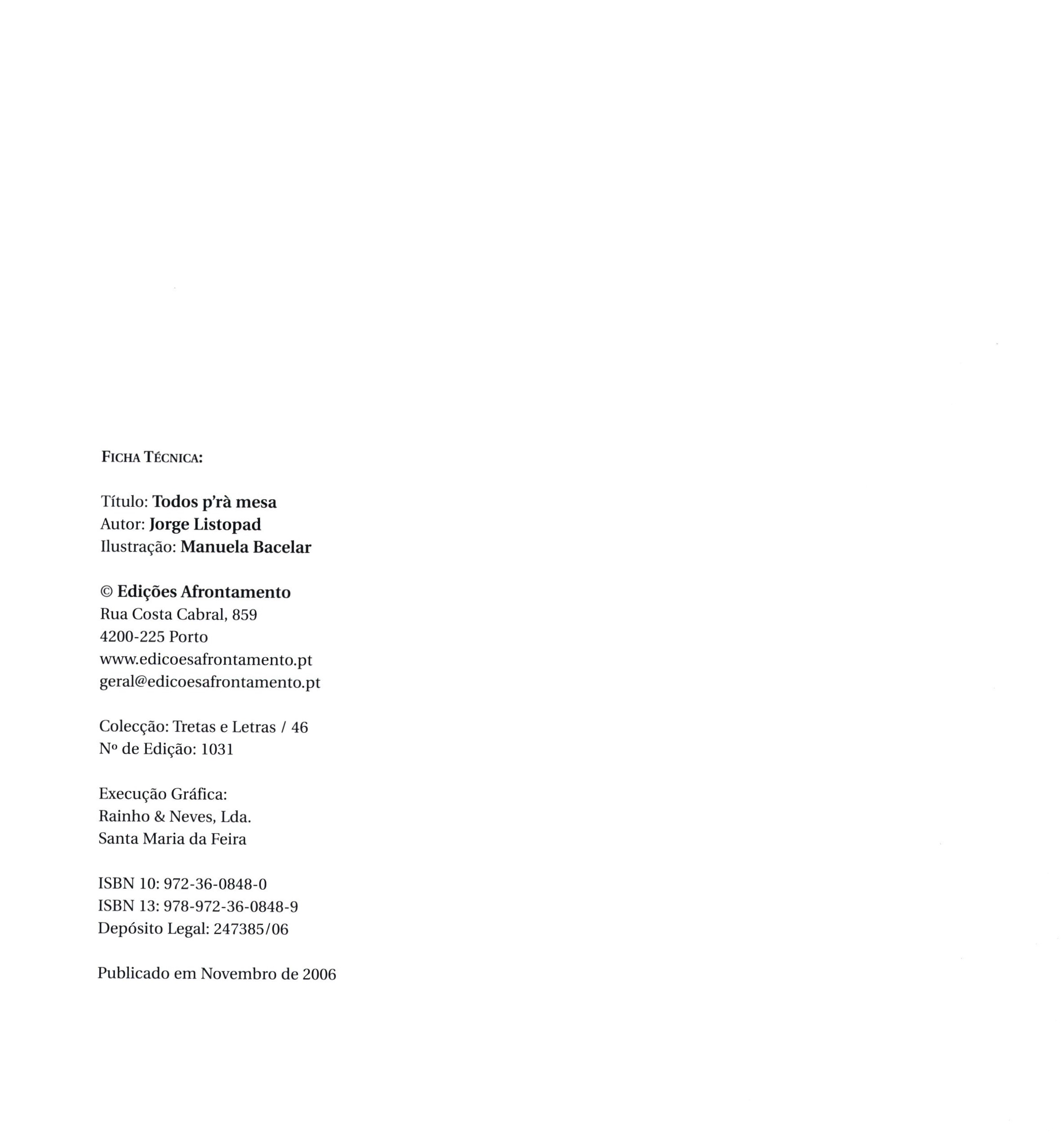 Title information Todos p'rà mesa / Jorge Listopad ; Manuela Bacelar Personal name Listopad, František, 1921-2017 (Author) Další autoři Bacelar, Manuela, (Illustrator) 1943- Corporation Edicões Afrontamento (Publisher) Publication Porto : Edições Afrontamento, 2006 Scope 103 stran : barevné ilustrace ; 23 cm ISBN 978-972-36-0848-9 (vázáno) Edition Tretas e Letras ; 46