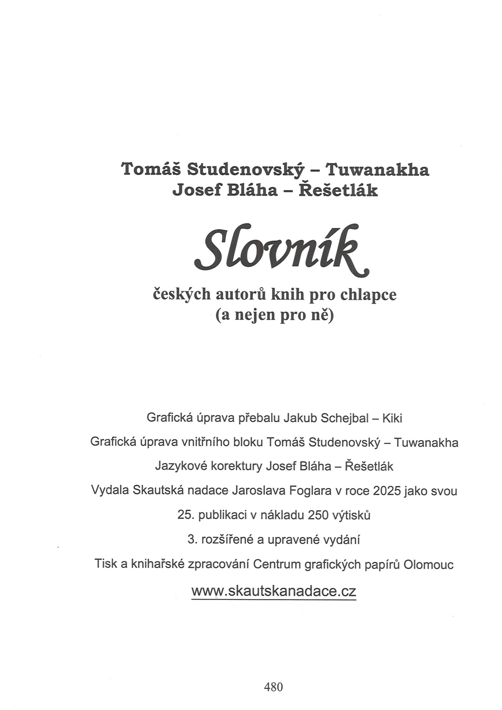 Názvové údaje Slovník českých autorů knih pro chlapce (a nejen pro ně) / Tomáš Studenovský, Josef Bláha Osobní jméno Studenovský, Tomáš, 1973- (Autor) Další autoři Bláha, Josef, 1952- (Autor) Korp. Skautská nadace Jaroslava Foglara (Nakladatel, vydavatel) Centrum grafických papírů Olomouc (tiskařské a knihařské studio) (Tiskař) Údaje o vydání 3. rozšířené a upravené vydání Nakladatel [Praha] : Skautská nadace Jaroslava Foglara, 2025 Výrobce Olomouc : Centrum grafických papírů Rozsah 480 stran : ilustrace, portréty ; 22 cm ISBN (Vázáno) Země vyd. Česko Jazyk dok. čeština Poznámky Barevná ilustrovaná vazba bez přebalu. - Zdobené předsádky. - Ilustrovaný titulní list. - Úvod. - Černobílé reprodukce ilustrací různých autorů. - Černobílé fotoportréty. - Slovníková hesla