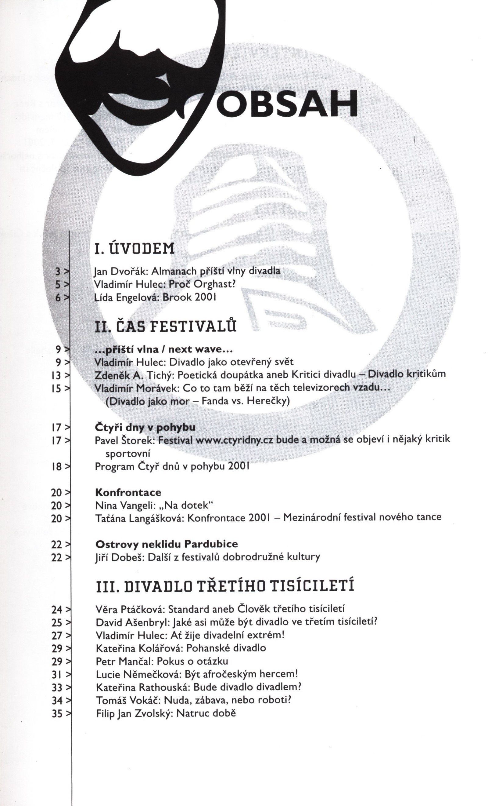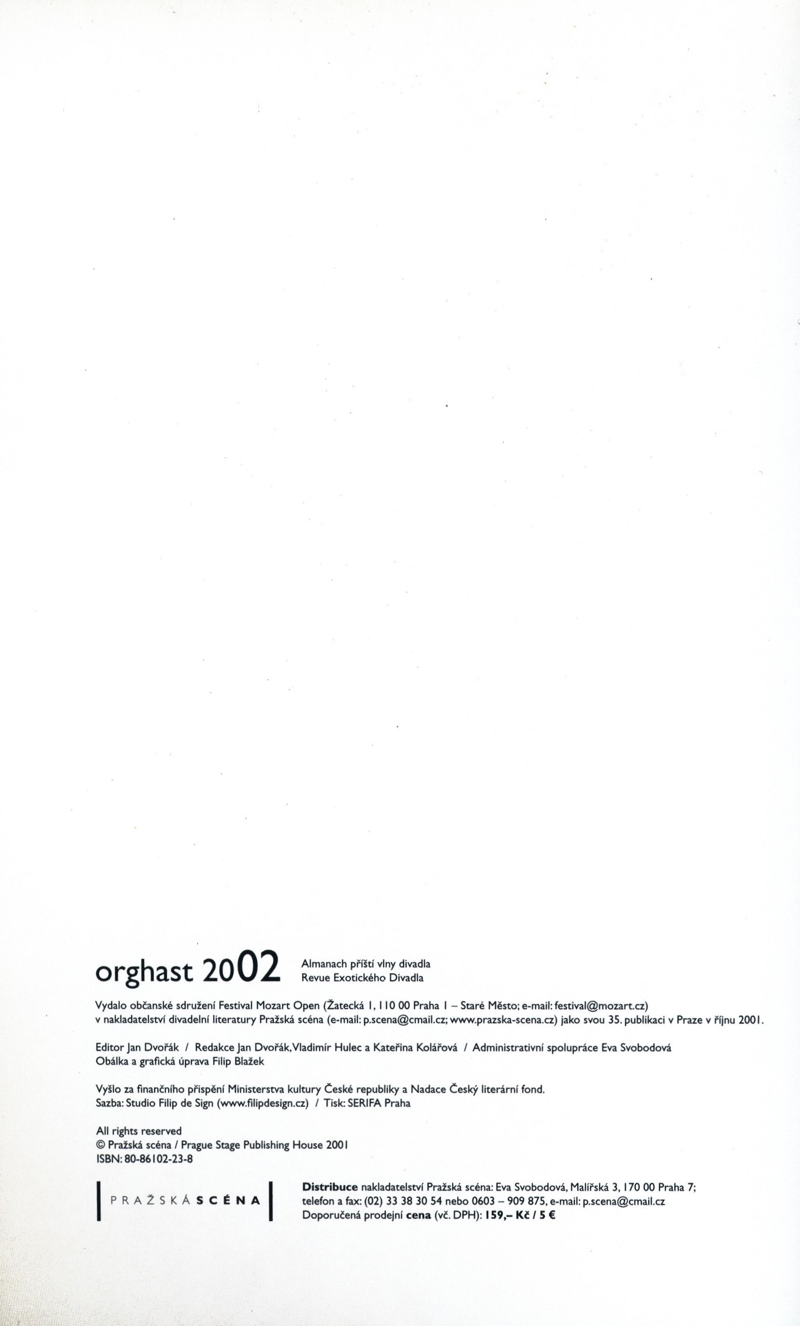 Title information Orghast 2002 : almanach příští vlny divadla, Revue Exotického Divadla / Editor Jan Dvořák ; redakce Jan Dvořák, Vladimír Hulec, Kateřina Kolářová ; administrativní spolupráce Eva Svobodová ; obálka a grafická úprava Filip Blažek Personal name Dvořák, Jan, 1951- (Editor) Další autoři Hulec, Vladimír, 1958- (Redactor) Kočičková, Kateřina, 1978- (Redactor) Klíčová, Eva, 1977- (Collaborator) Blažek, Filip, 1974- (Bookjacket designer) (Book designer) Corporation Pražská scéna (nakladatelství) (Publisher) Serifa (tiskárna) (Printer) Publication Praha : Pražská scéna, 2001 Manufacture Serifa Praha, Scope 95 stran : čb. fotografie, čb. ilustrace, čb. reprodukce ; 24 cm ISBN 80-86102-23-8 (brožováno) Country Czech Republic Language Czech Note Zdobená obálka. - Tiráž. - Obsah. - Úvod. - Resumé.