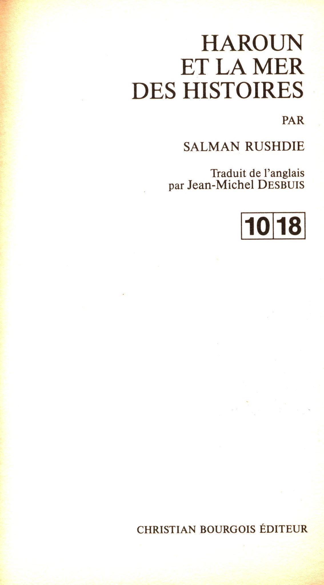 Title information Haroun et la mer des histoires / par Salman Rushdie ; traduit de l'anglais par Jean-Michel Desbuis Personal name Rushdie, Salman, 1947- (Author) Další autoři Desbuis, Jean-Michel (Translator) Corporation Bourgois (nakladatelství) (Publisher) Union genérale d'éditions (Publisher) Cox & Wyman Ltd. (tiskárna) (Printer) Publication Paris : Christian Bourgois Éditeur, [1993] Manufacture [London] : Cox & Wyman Copyright notice date ©1991 Scope 249 stran ; 18 cm ISBN 2-264-01904-2 (brožováno) Edition 10/18, (UGÉ) ; 2402