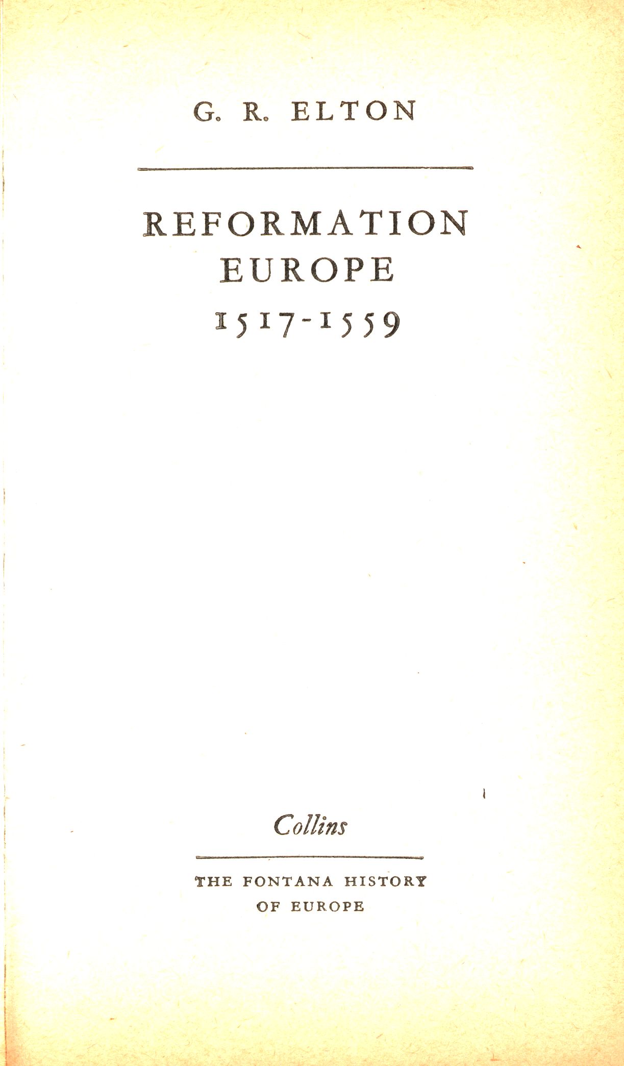 Title information Reformation Europe : 1517-1559 / G. R. Elton Personal name Elton, Geoffrey Rudolph, (Author) Sir, 1921-1994 Další autoři Collins (nakladatelství, Londýn, Velká Británie) (Publisher) Publication London and Glasgow : Collins, [1963] Manufacture Collins Copyright notice date ©1963 Scope 349 stran : mapy ; 18 cm ISBN (brožován) Edition The Fontana History of Europe ; 2124L