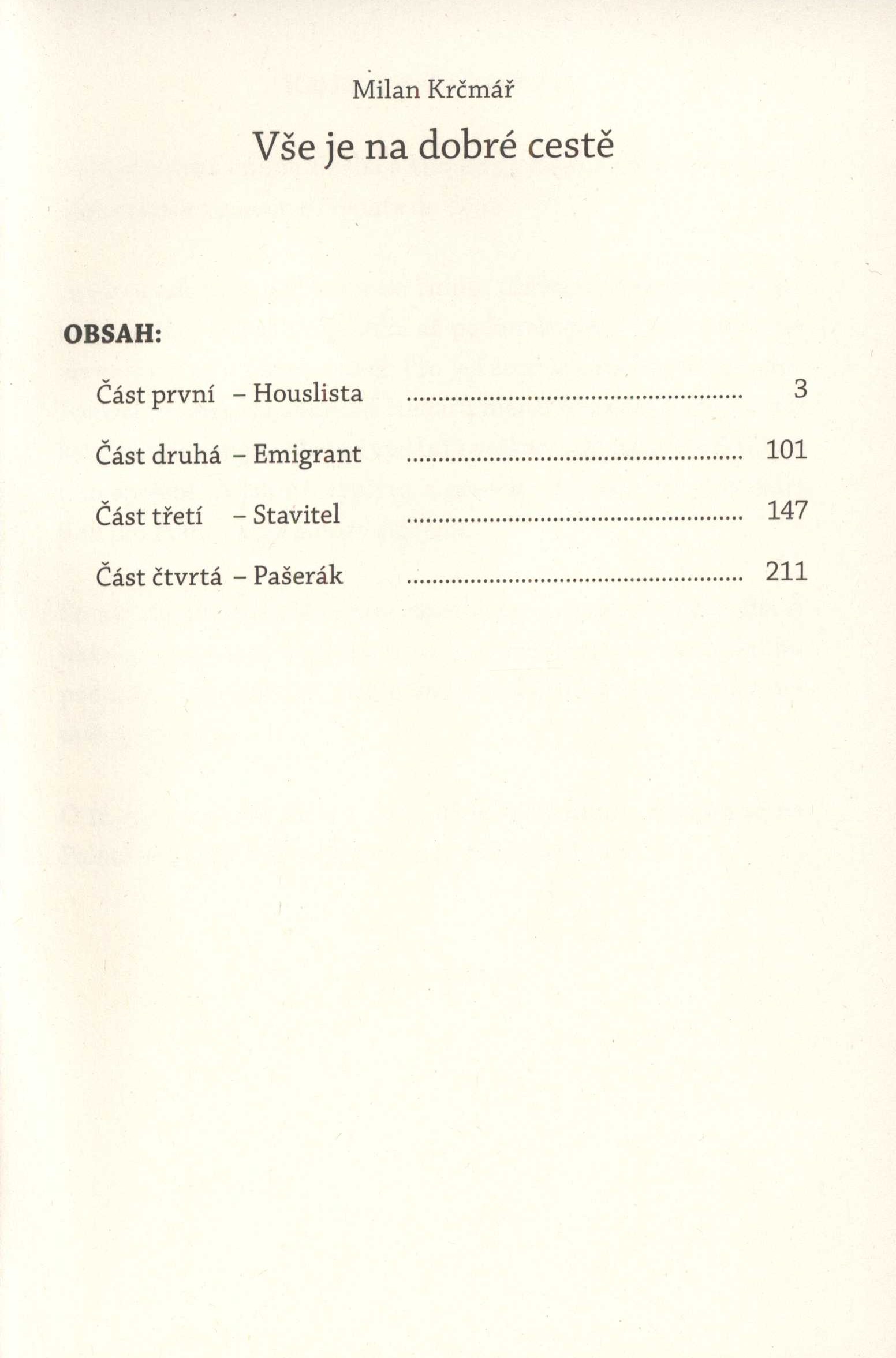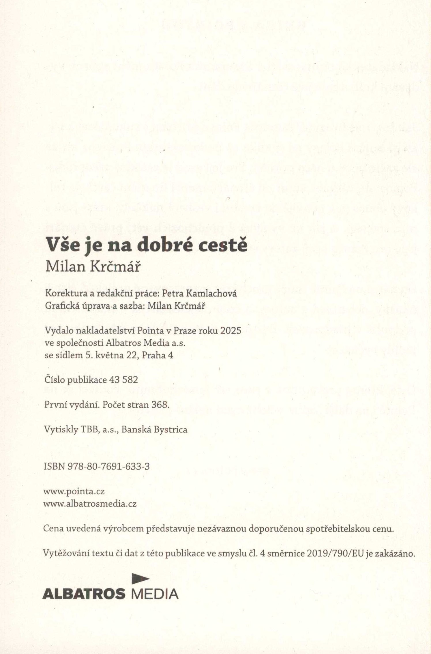 Title information Vše je na dobré cestě / Milan Krčmář ; grafická úprava a sazba Milan Krčmář Personal name Krčmář, Milan, 1981- (Author) (Book designer) (Compositor) Další autoři Pointa (nakladatelství) (Publisher) Tlačiareň BB (tiskárna) (Printer) Edition statement První vydání Publication V Praze : Pointa, 2025 Manufacture Banská Bystrica : TBB, a.s. Scope 363 stran : ilustrace, 1 mapa ; 21,5 cm ISBN 978-80-7691-633-3 (vázáno) Country Czech Republic Language Czech Note Zdobená barevná obálka. - Zdobený titulní list. - Poděkování. - Černobílé fotografie a mapka v textu s popiskami. - Obsah. - Na zadní straně obálky anotace a upoutávka na další autorovy vydané knihy.