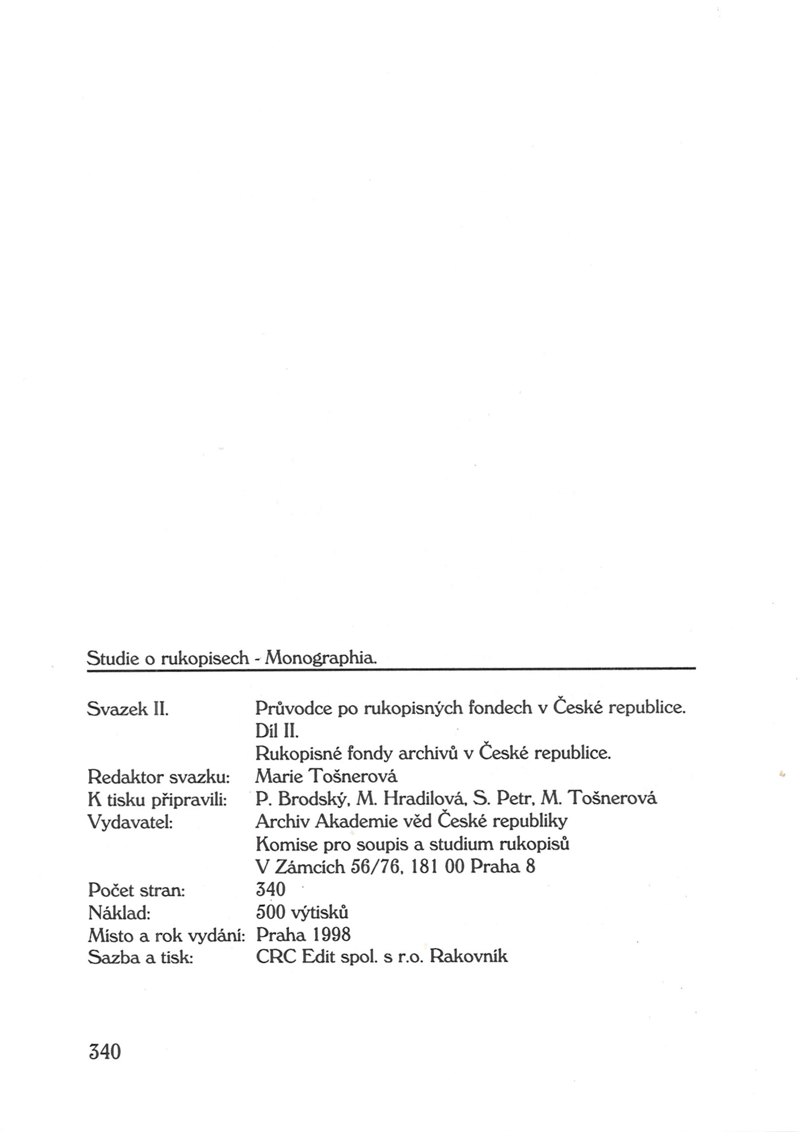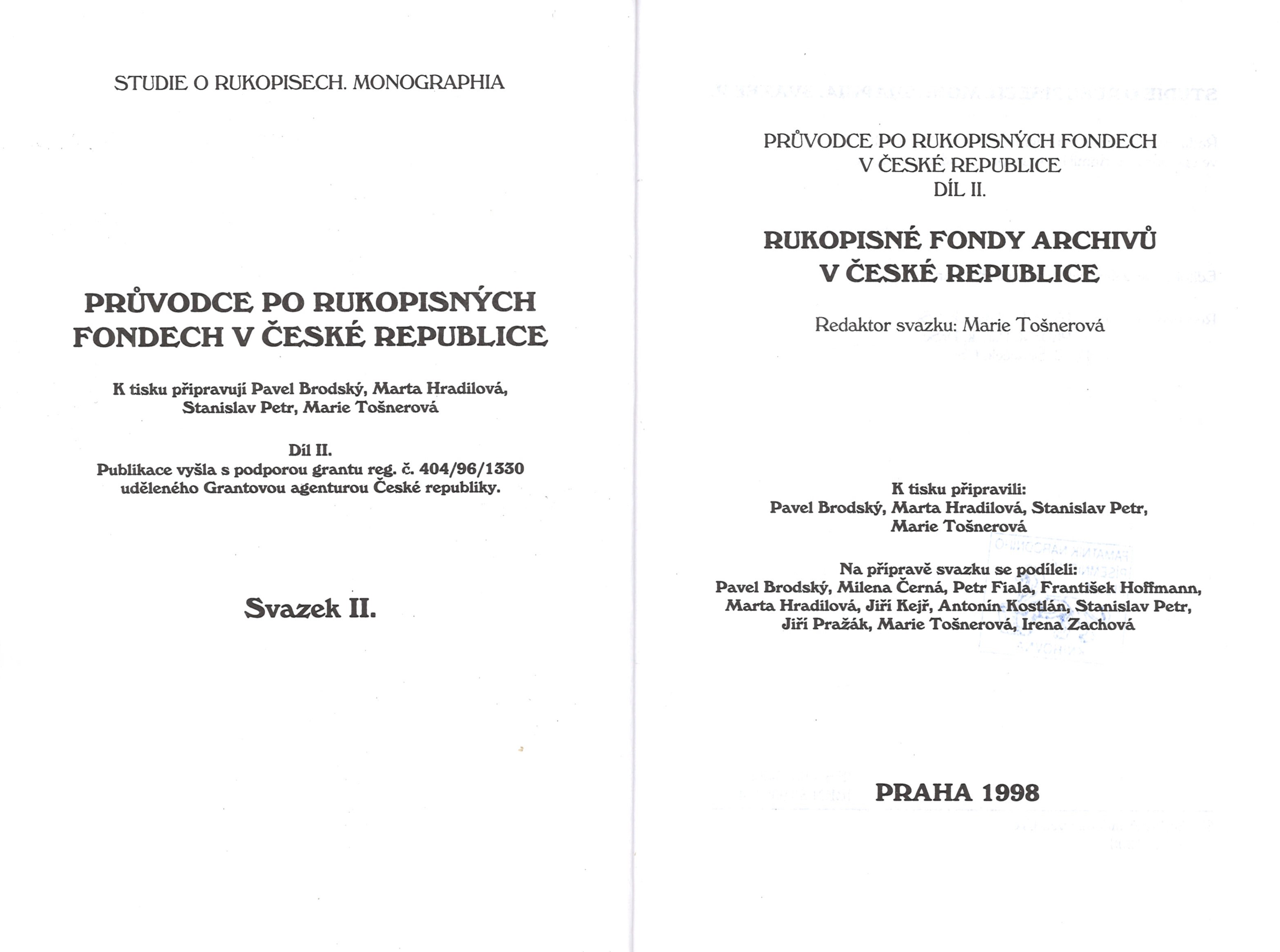 Title information Průvodce po rukopisných fondech v České republice. Díl II, Rukopisné fondy archivů v České republice / redaktor svazku Marie Tošnerová ; k tisku připravili Pavel Brodský, Marta Hradilová, Stanislav Petr, Marie Tošnerová Další autoři Tošnerová, Marie, 1956- (Compiler) Brodský, Pavel, 1954-2024 (Compiler) Hradilová, Marta (Compiler) Petr, Stanislav, 1944- (Compiler) Corporation Masarykův ústav - Archiv (Akademie věd ČR). Komise pro soupis a studium rukopisů (Publisher) CRC Edit (tiskárna) (Printer) Publication Praha : Archiv Akademie věd České republiky, Komise pro soupis a studium rukopisů ; 1998 Manufacture [Rakovník] : CRC Edit spol. s r.o. Scope 340 stran : ilustrace, faksimile ; 21 cm ISBN 80-902464-2-7 (brožováno) Edition Studie o rukopisech, Monographia, (Masarykův ústav a Archiv Akademie věd ČR, v.v.i.) ; svazek II