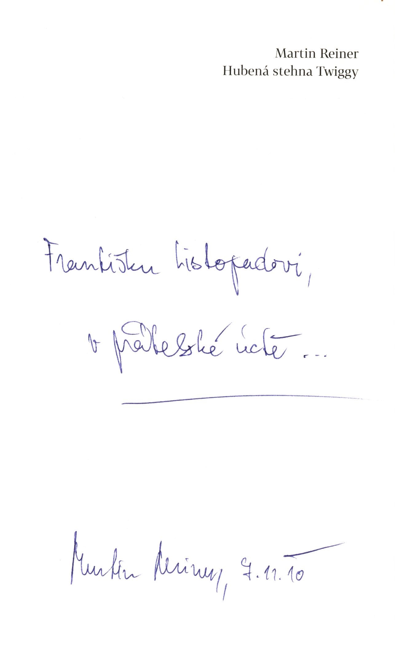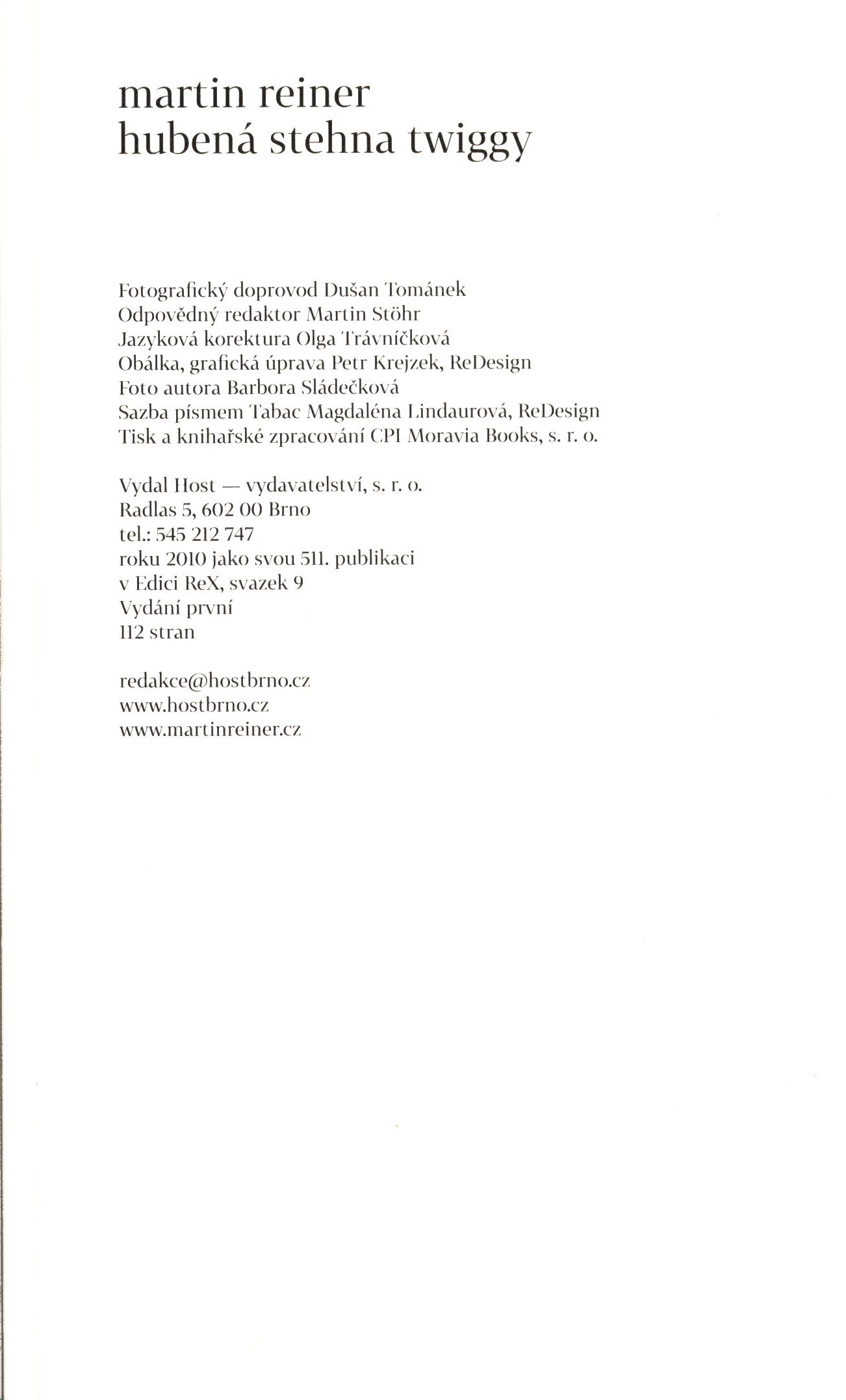 Title information Hubená stehna Twiggy / Martin Reiner ; fotografický doprovod Dušan Tománek Personal name Reiner, Martin, 1964- (Author) (Dedicator) Další autoři Tománek, Dušan, 1973- (Photographer) Listopad, František, 1921-2017 (Dedicatee) Corporation Host (nakladatelství) (Publisher) CPI Moravia Books (tiskárna) (Printer) Edition statement Vydání první Publication Brno : Host, 2010 Manufacture CPI Moravia Books, s.r.o. Scope 103 stran : barevné ilustrace ; 19 cm ISBN 978-80-7294-404-0 (brožováno) Edition ReX ; svazek 9