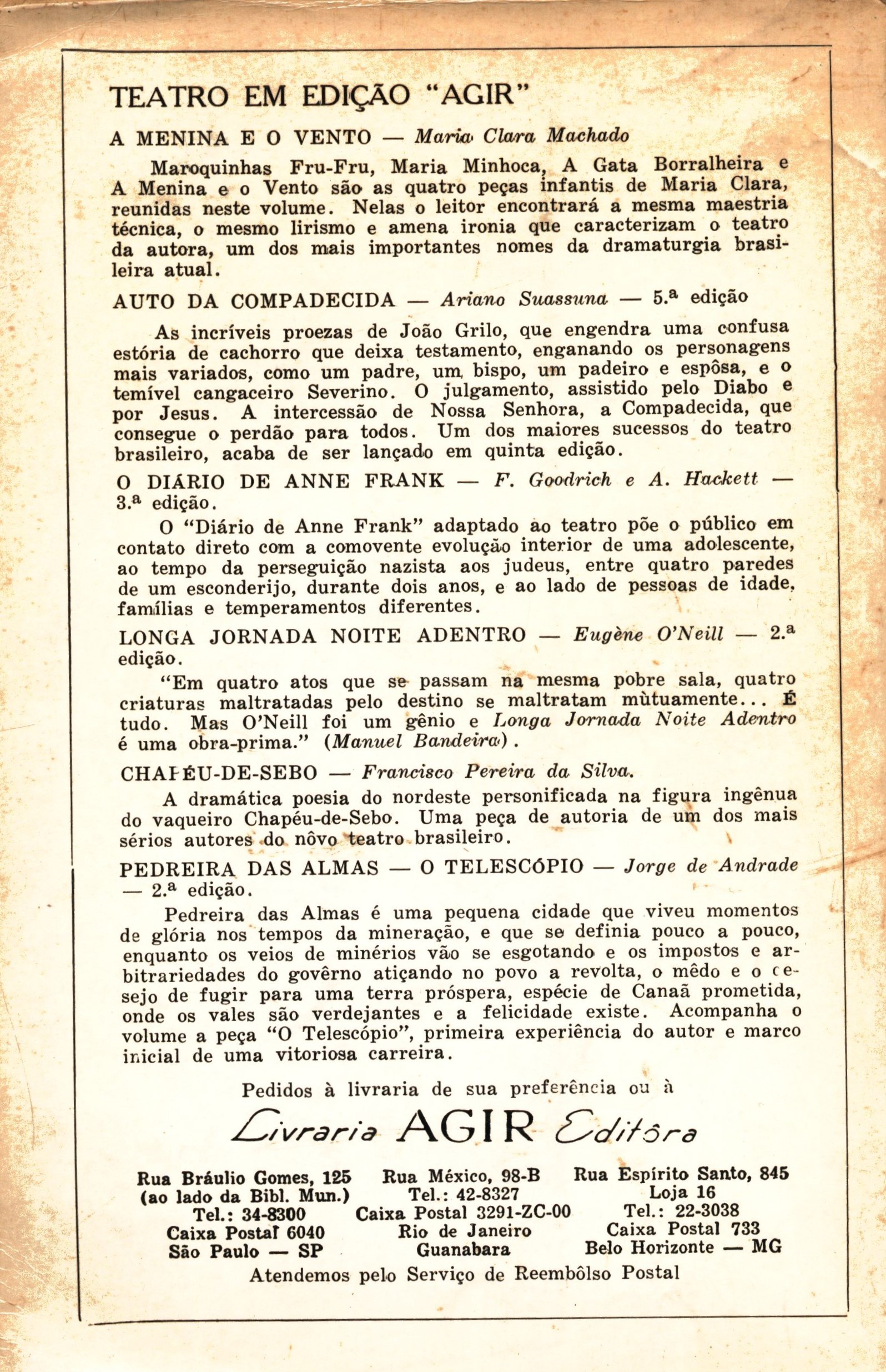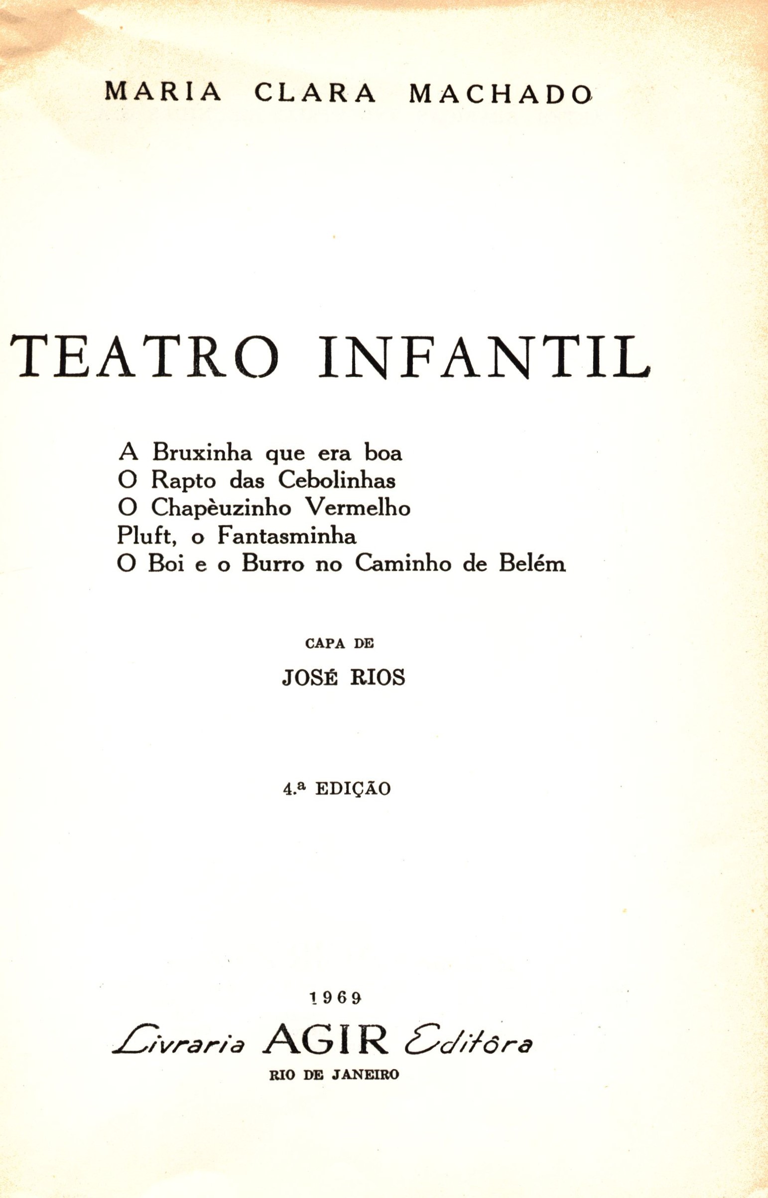 Title information Teatro infantil / Maria Clara Machado ; Capa de José Rios Personal name Machado, Maria Clara, 1921-2001 (Author) Další autoři Rios, José (Bookjacket designer) Corporation Livraria Agir Editôra (Publisher) Borsoi s / a. Indústria e comércio (Printer) Edition statement 4.a edição Manufacture Rio de Janeiro : Livraria Agir Editôra , 1969 Scope 263 stran : čb. fotografie , čb. ilustrace 22 cm ; ISBN (Vázáno) Country Brazil Language Portuguese Note Ilustrovaná obálka. - Typografický titulní list. - Obsah. - Čb. fotografie. - Čb. ilustrace. - Na přední záložce několik slov Carlose Drummond de Andrade o autorce. - Na zadní záložce pochvalné kritiky díla autorky. - Na zadní straně obálky soupis některých dalších knih vydaných ve stejném vydavatelství jako kniha autorky.