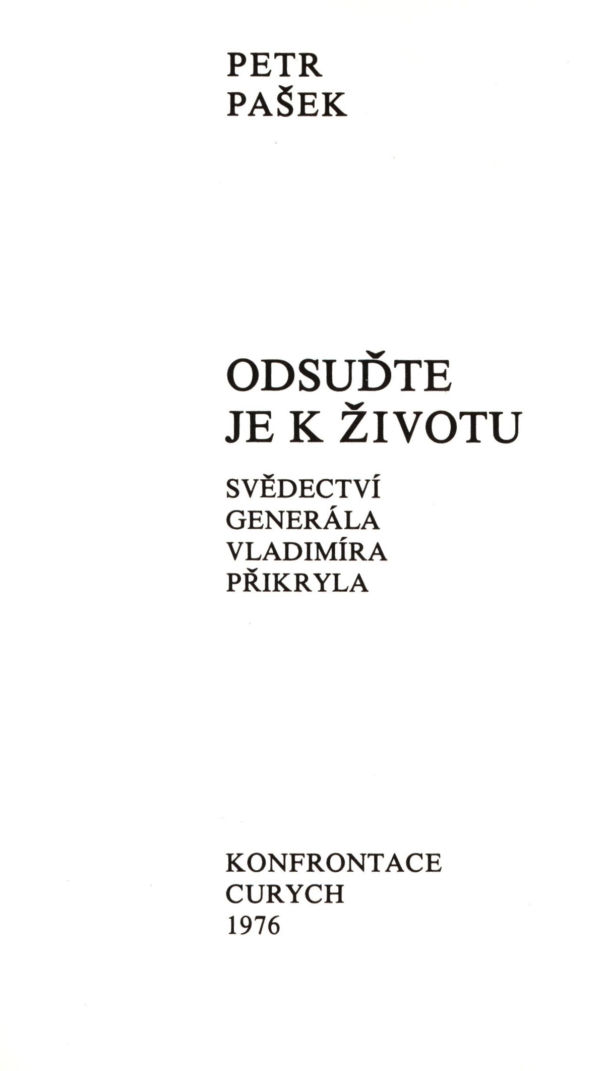 Title information Odsuďte je k životu : svědectví generála Vladimíra Přikryla / Petr Pašek Personal name Pašek, Petr, 1923-1996 (Author) Další autoři Konfrontace (nakladatelství) (Publisher) Konrad Kyburz (tiskárna) (Printer) Edition statement Druhé české vydání Manufacture Curych : Konfrontation AG, 1976 Dielsdorf : Konrad Kyburz, Scope 180 stran, 24 stran nečíslované obrazové přílohy : čb. fotografie ; 19 cm ISBN 3-85770-049-1 (vázáno) Edition Knižnice Konfrontace, (Konfrontation AG Verlag, Zürich)
