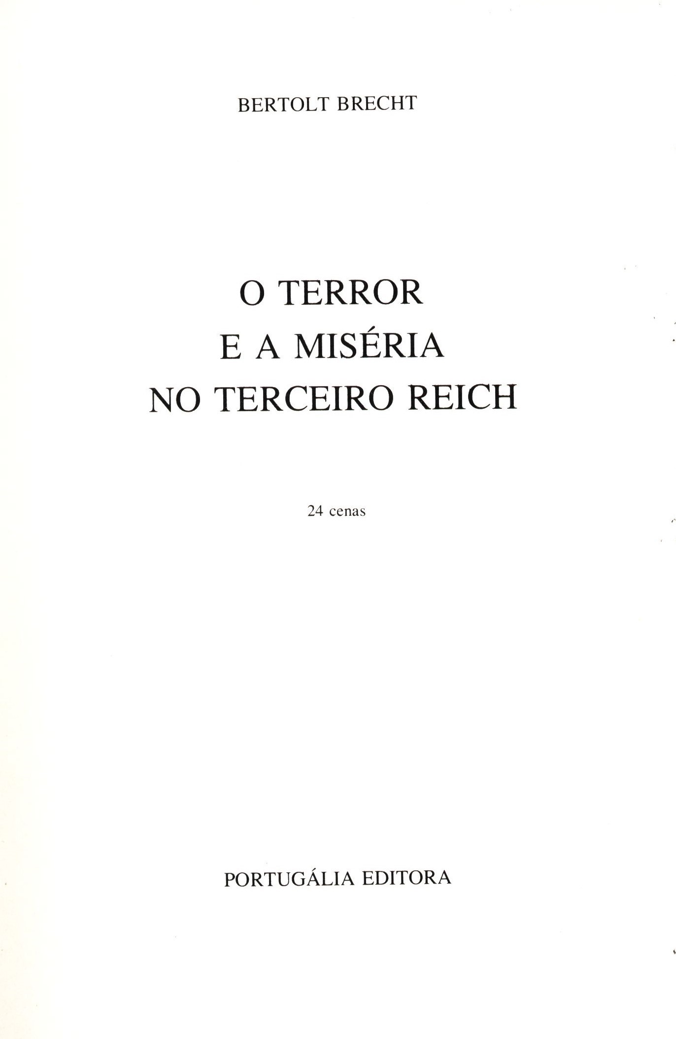 Title information O terror e a miséria no terceiro reich / Bertolt Brecht Personal name Brecht, Bertolt, 1898-1956 (Author) Další autoři Portugália Editora (Publisher) Compugráfica, lda. (Printer) Publication [místo vydání není známé] : Portugália Editora, [datum vydání není známé] Manufacture Lisabon : Compugráfica, lda., [datum vydání není známé] Scope 140 stran ; 19 cm ISBN (Vázáno) Edition Teatro, VI