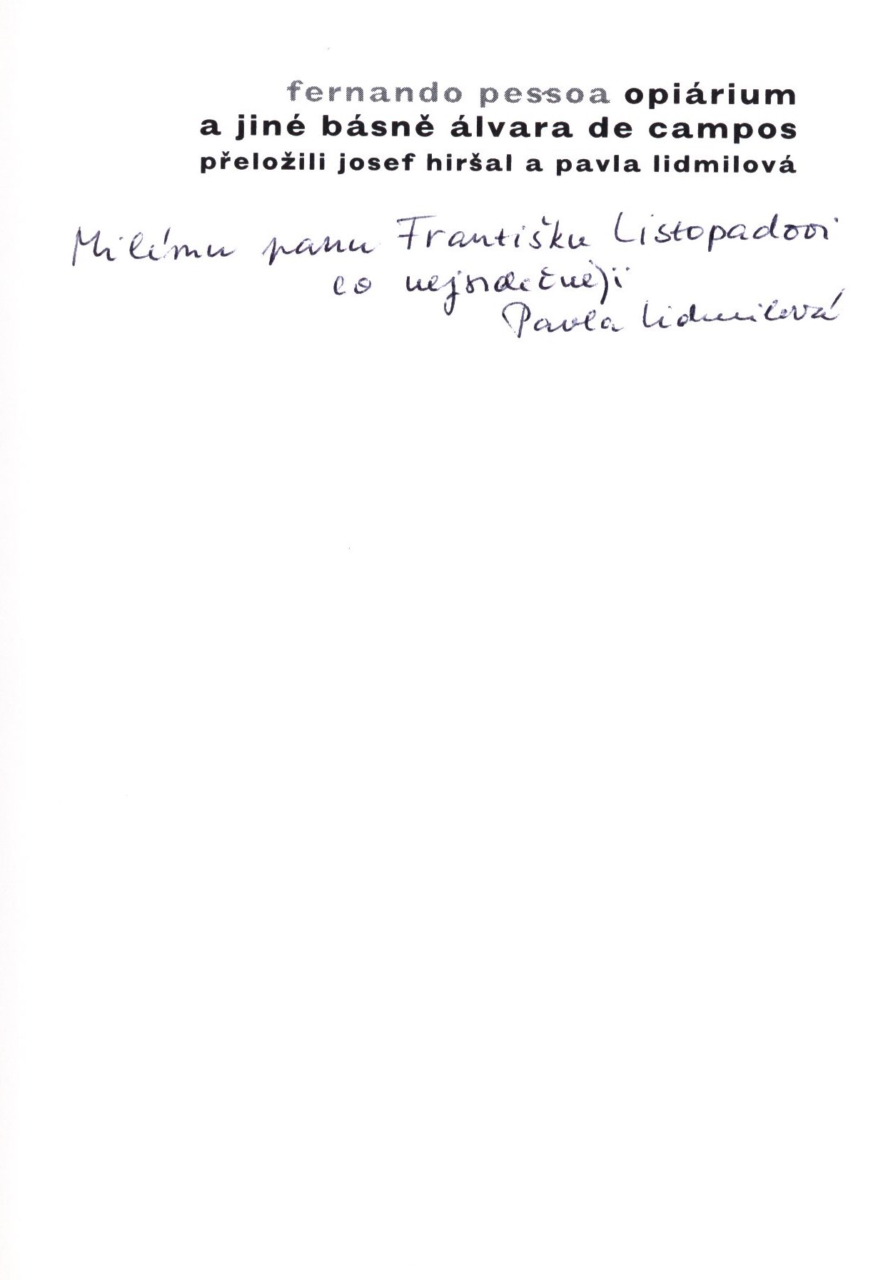 Title information Opiárium a jiné básně Álvara de Campos / Fernando Pessoa ; přeložili Josef Hiršal a Pavla Lidmilová Personal name Pessoa, Fernando, 1888-1935 (Author) Další autoři Hiršal, Josef, 1920-2003 (Translator) Lidmilová, Pavla, 1932-2019 (Translator) (Dedicator) Listopad, František, 1921-2017 (Dedicatee) Corporation Nakladatelství Paseka (Publisher) Tiskárny Havlíčkův Brod (firma) (Printer) Edition statement Vydání první Publication Praha : Litomyšl : Nakladatelství Paseka, 2003 Manufacture Havlíčkův Brod : Tiskárny Havlíčkův Brod, Scope 116 stran : ilustrovaný frontispis ; 18 cm ISBN 80-7185-572-3 (vázáno) Edition Klub přátel poezie (Paseka). Výběrová řada, ročník 2002/2003