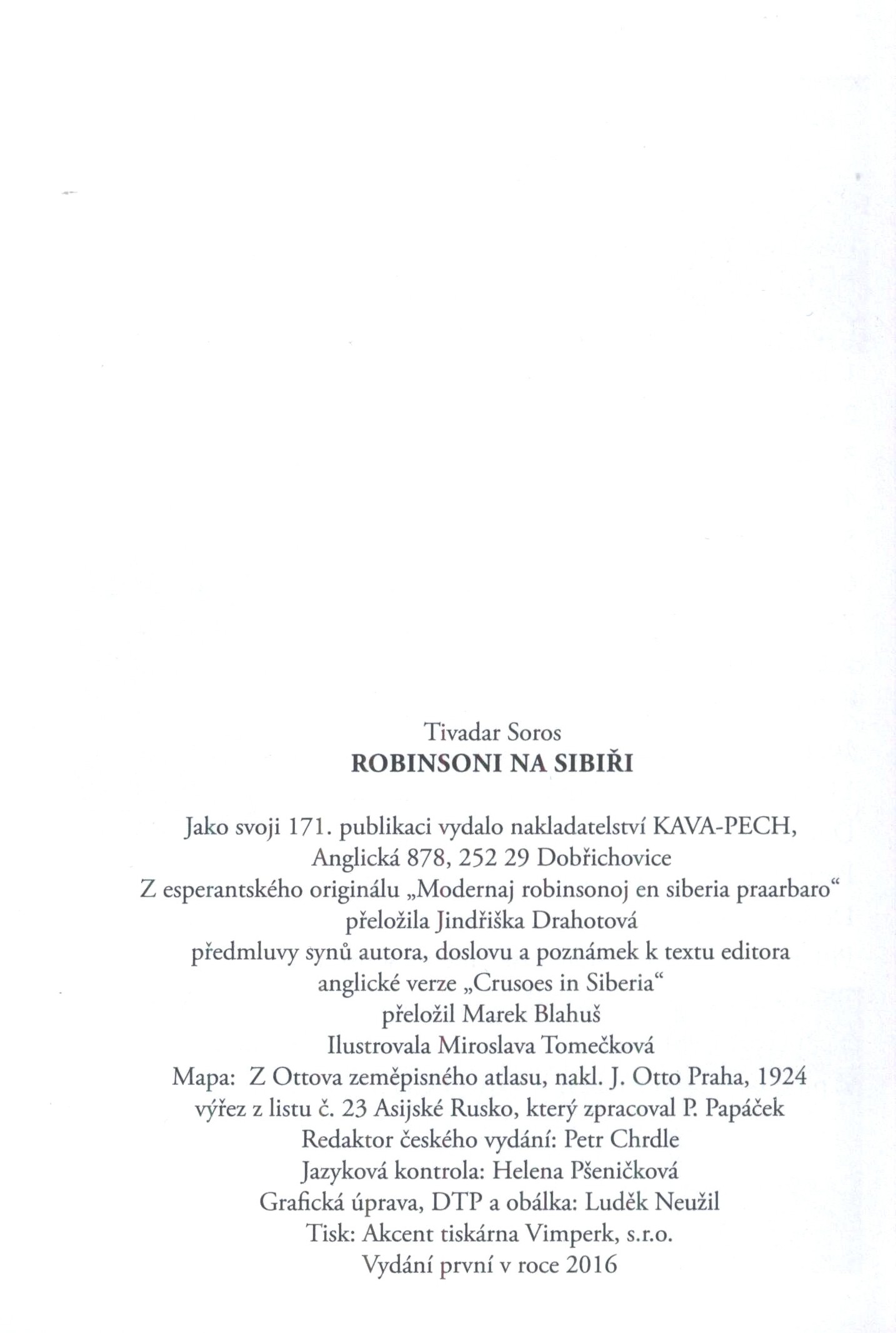 Title information Robinsoni na Sibiři a Nejspravedlivější soud / Tivadar Soros ; z esperantského originálu "Modernaj robinsonoj en siberia praarbaro" přeložila Jindřiška Drahotová ; předmluvy synů autora, doslovu a poznámek k textu editora anglické verze "Crusoes in Siberia" přeložil Marek Blahuš ; ilustrovala Miroslava Tomečková ; grafická úprava, DTP a obálka Luděk Neužil Personal name Soros, Tivadar, 1893-1968 (Author) Další autoři Drahotová, Jindřiška, 1938- (Translator) Blahuš, Marek, 1986- (Translator) Neužil, Luděk, 1955- (Book designer) (Typographer) (Bookjacket designer) Corporation KAVA-PECH (nakladatelství) (Publisher) Akcent tiskárna Vimperk (Printer) Edition statement Vydání první Publication Dobřichovice : KAVA-PECH, 2016 Manufacture Akcent tiskárna Vimperk, s.r.o. Scope 102 stran, 1 nečíslovaný složený list obrazové přílohy : ilustrace (některé barevné), 1 mapa ; 22 cm ISBN 978-80-87169-60-5 (vázáno) Country Czech Republic Language Czech Language of the original Esperanto * English Note Zdobená barevná obálka. - Světle žlutá vazba s černým textem na hřbetě. - Na přední záložce obálky úryvek z předmluvy G. Sorose, na zadní záložce biografická poznámka o G. Sorosovi s barevným fotem a vzpomínka C. Höschla na G. Sorose s barevným fotem. - Předmluva G. Sorose. - Předmluva P. Sorose. - Úvod. - Černobílé, převážně celostránkové ilustrace. - Dovětek. - Poznámky. - Doslov editora (H. Tonkin). - Složená barevná mapa s legendou. - Přílohy. - Nejspravedlivější soud. - Nakladatelská inzerce. - Obsah. - Na zadní straně obálky poznámka o autorovi s fotem, editorovi a překladatelce.