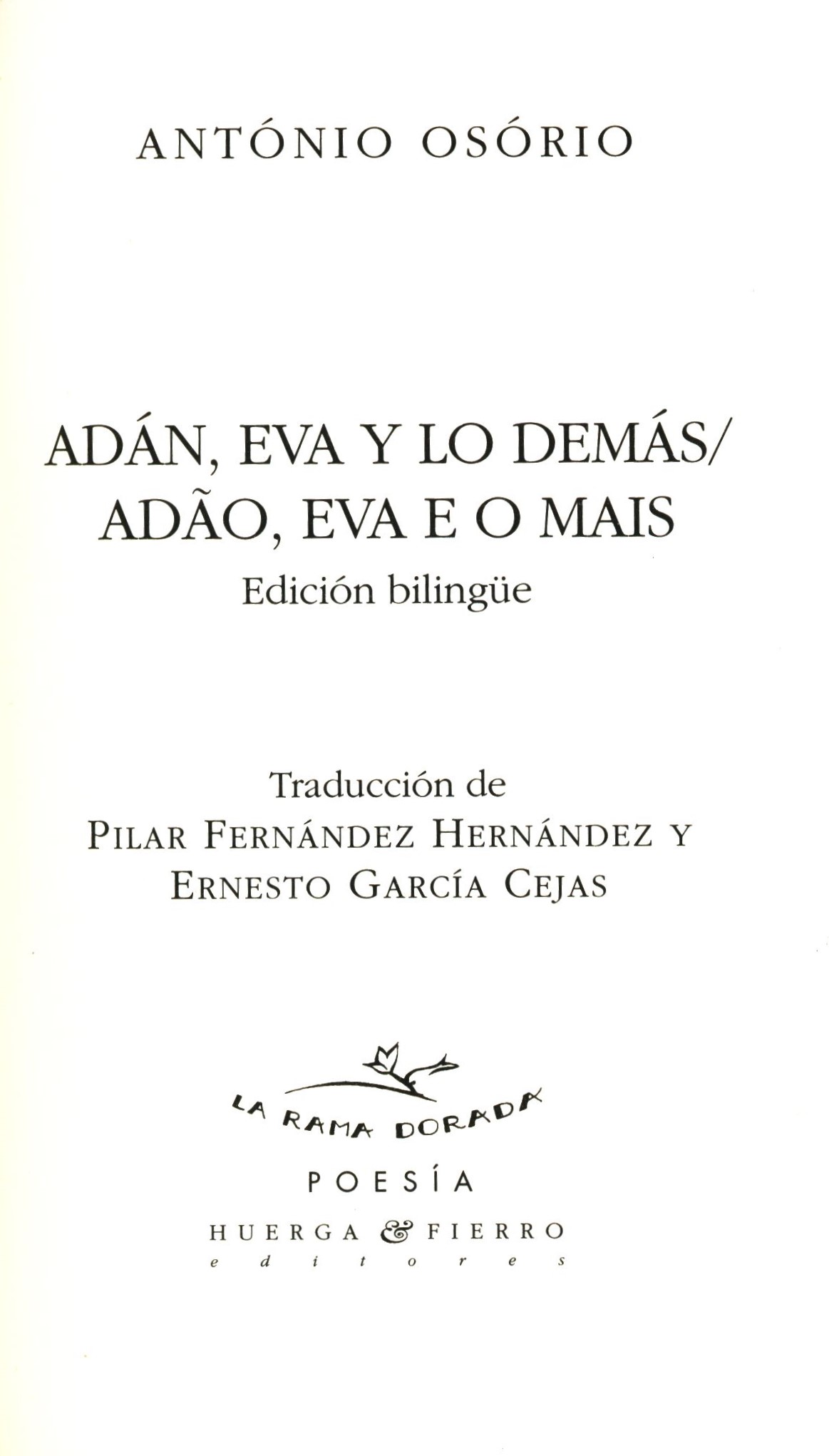 1. Title informationAdán, Eva y lo demás / Adão, Eva e o mais : Edición bilingüe / António Osório ; traducción de Pilar Fernández Hernández y Ernesto García Cejas