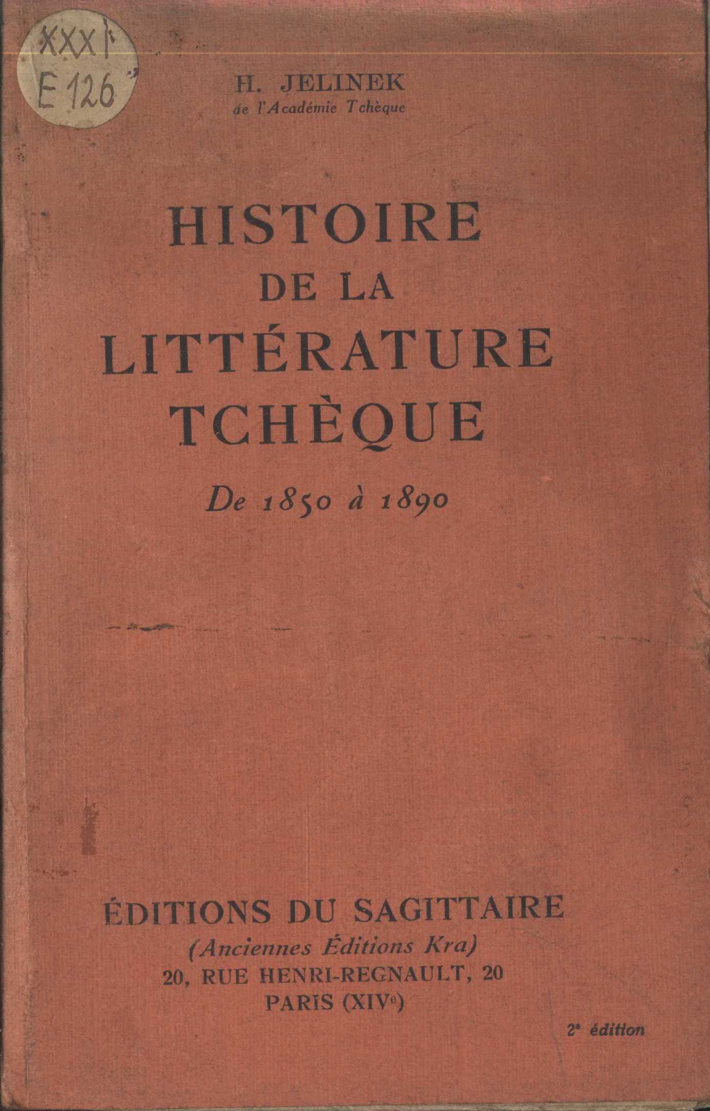 Title information Histoire de la littérature tchèque : de 1850 à 1890 / H. Jelinek de l'Académie Tchèque Personal name Jelínek, Hanuš, 1878-1944 (Author) Další autoři Sagittaire (firma) (Publisher) Établissements Busson (tiskárna) (Printer) Edition statement Deuxième édition Publication Paris : Sagittaire, [1933] Manufacture Établissements Busson Scope 359 stran ; 19 cm ISBN (Brožováno) Country France Language French Note Oranžová typografická obálka. - Informace o dalších dílech autora.