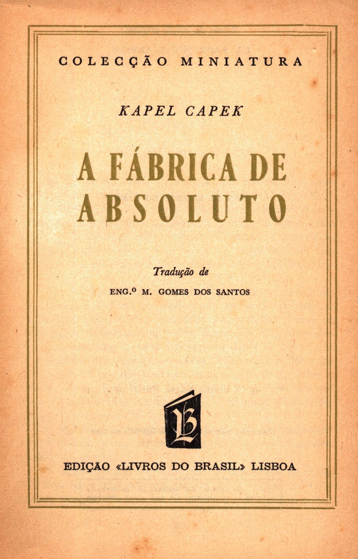 Title information A fábrica de absoluto / Karel Capek ; tradução de Eng.o M. Gomes dos Santos Personal name Čapek, Karel, 1890-1938 (Author) Další autoři Gomes dos Santos, M. (Translator) Corporation Livros do Brasil (Publisher) (Printer) Publication Lisboa : Livros do Brasil, [1945] Copyright notice date ©1945 Scope 190 stran ; 16 cm ISBN (Brožováno) Edition Colecção Miniatura (Livros do Brasil) ; 140