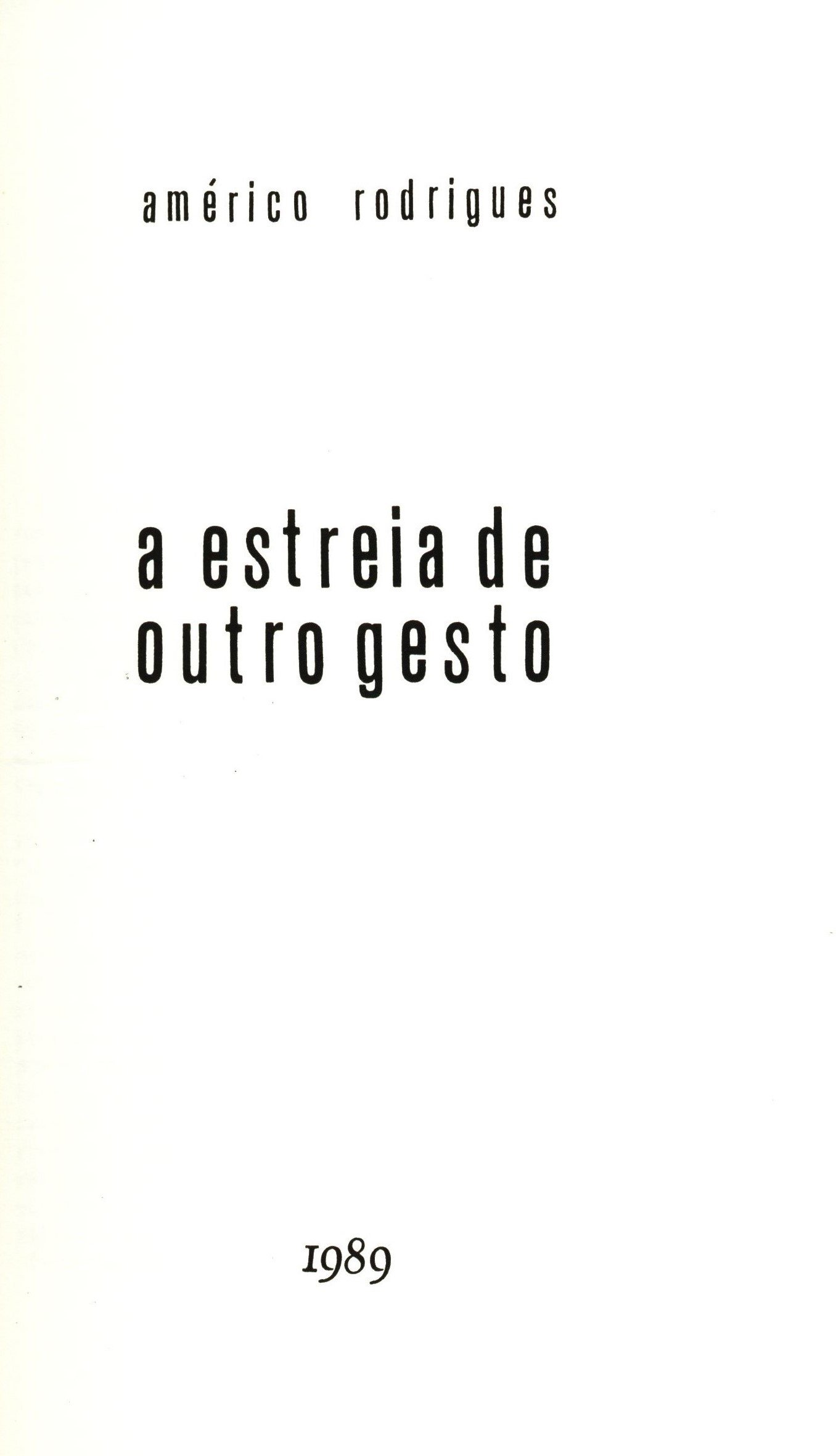 Title information A estreia de outro gesto / Américo Rodrigues Personal name Rodrigues, Américo (Author) (Publisher) Další autoři Oficinas de s. Miguel (Printer) Publication [Outeiro de S. Miguel – Guarda] : Américo Rodrigues, 1989 Manufacture Oficinas de s. Miguel Scope 59 stran ; 21 cm ISBN (Brožováno) Country Portugal Language Portuguese Note Zdobená obálka. - Předmluva