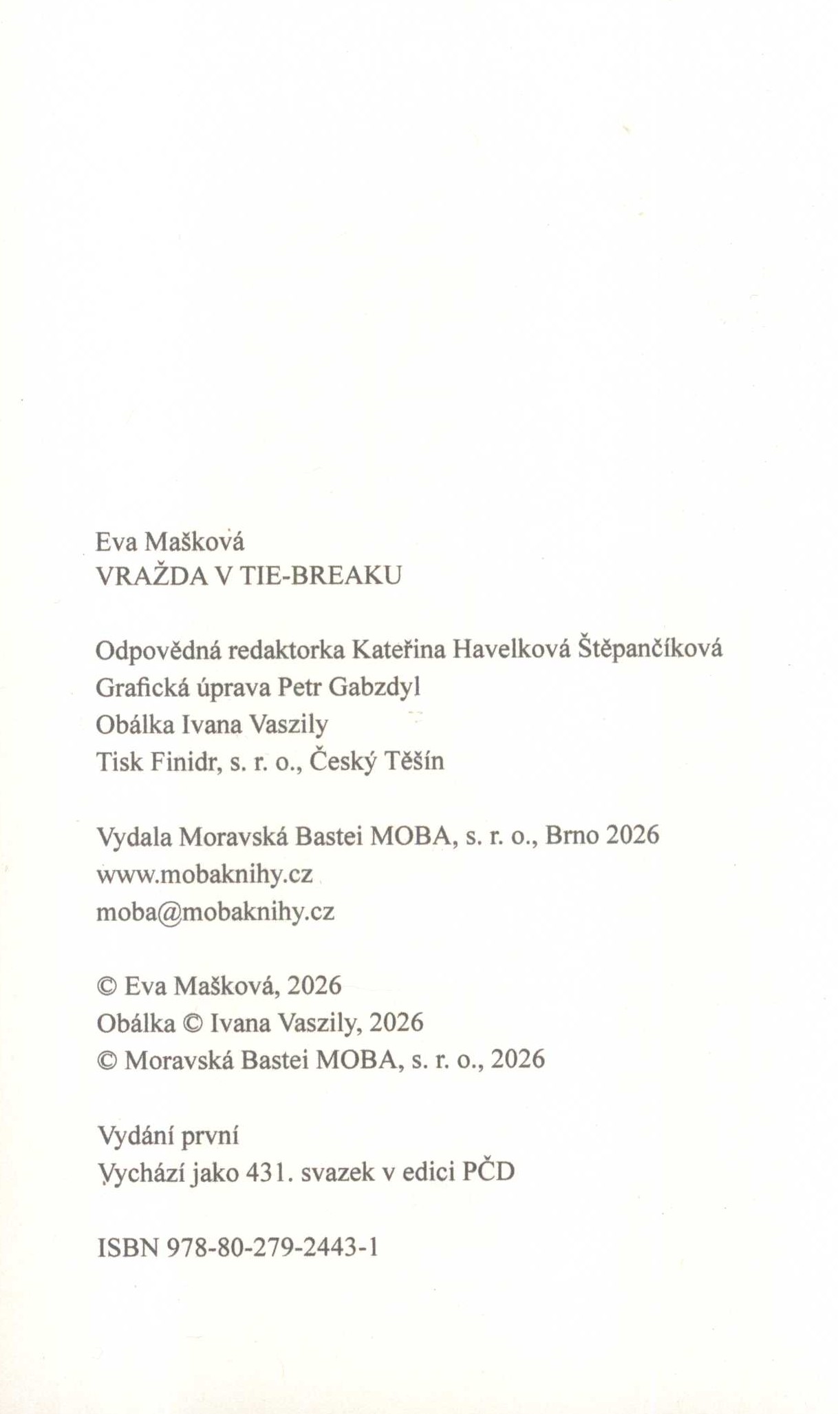 Title information Vražda v tie-breaku / Eva Mašková ; grafická úprava Petr Gabzdyl ; obálka Ivana Vaszily Personal name Mašková, Eva, 1958- (Author) Další autoři Gabzdyl, Petr, 1978- (Book designer) Dudková, Ivana, 1990- (Bookjacket designer) Corporation Nakladatelství MOBA (Publisher) Finidr (tiskárna) (Printer) Edition statement Vydání první Publication Brno : MOBA, 2026 Manufacture Český Těšín : Finidr, s.r.o. Scope 256 stran ; 19 cm ISBN 978-80-279-2443-1 (vázáno) Edition Původní česká detektivka ; 431. svazek