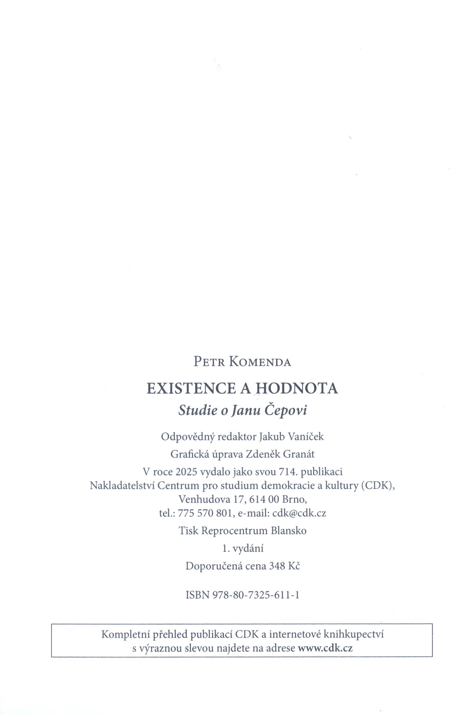 Title information Existence a hodnota : studie o Janu Čepovi / Petr Komenda ; grafická úprava Zdeněk Granát Personal name Komenda, Petr, 1975- (Author) Další autoři Granát, Zdeněk, 1965- (Book designer) Corporation Centrum pro studium demokracie a kultury (Publisher) Tiskárna Reprocentrum (Printer) Edition statement 1. vydání Publication Brno : Centrum pro studium demokracie a kultury, 2025 Manufacture Blansko : Reprocentrum Scope 287 stran : faksimile ; 21 cm ISBN 978-80-7325-611-1 (brožováno) Country Czech Republic Language Czech Note Zdobená barevná obálka. - Na přední záložce obálky anotace knihy, na zadní záložce bio-bibliografická poznámka o autorovi. - Černobílé faksimile s popiskami. - Ediční poznámka. - Seznam příloh. - Obsah.
