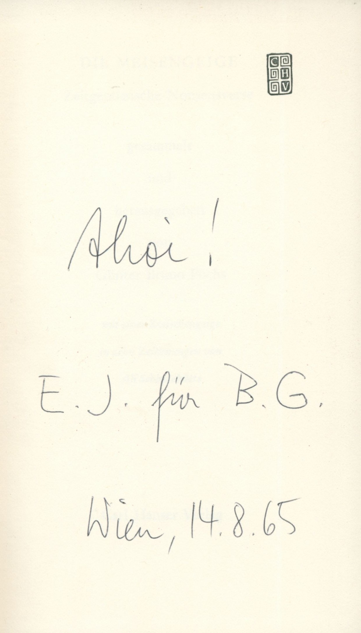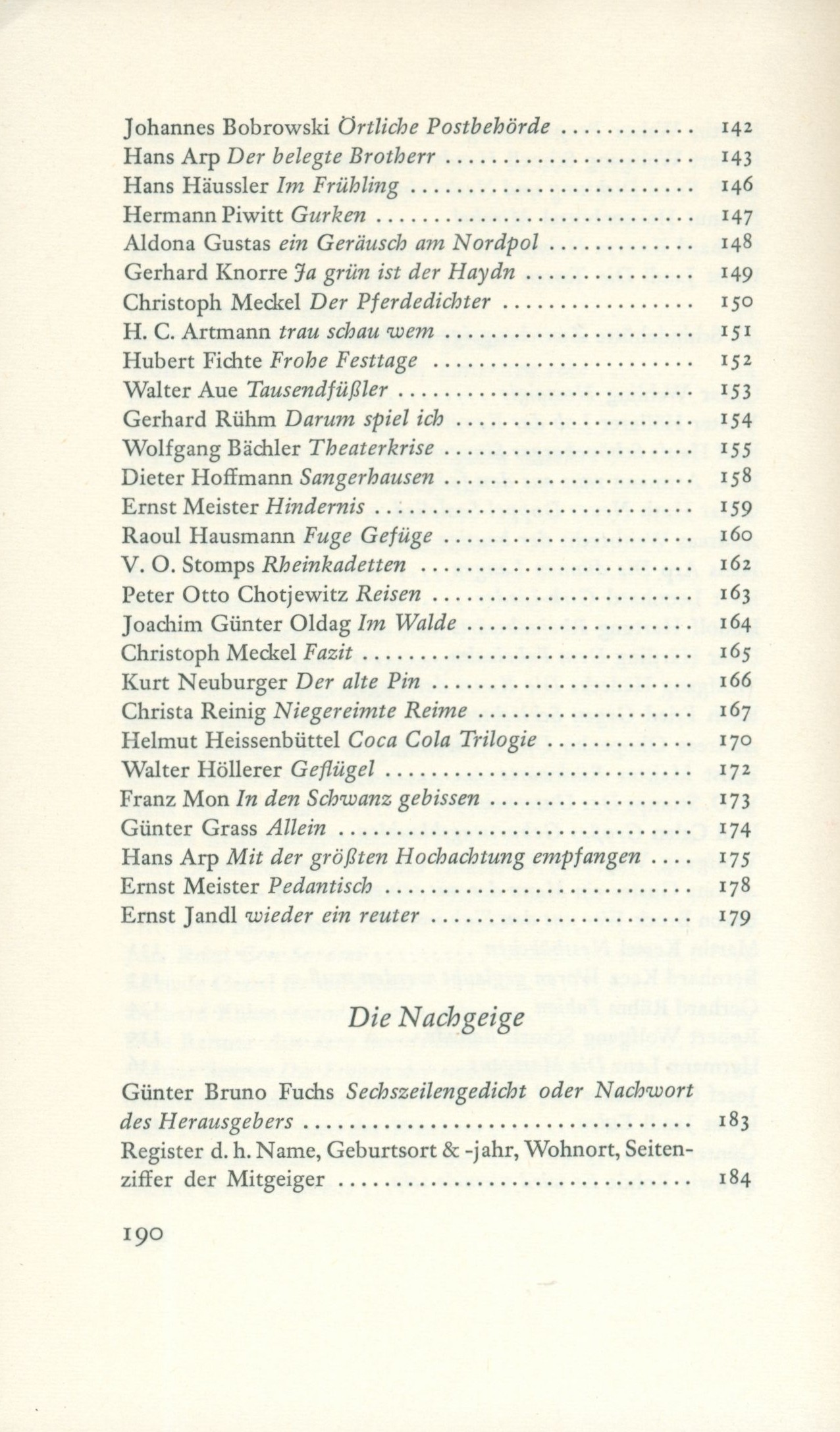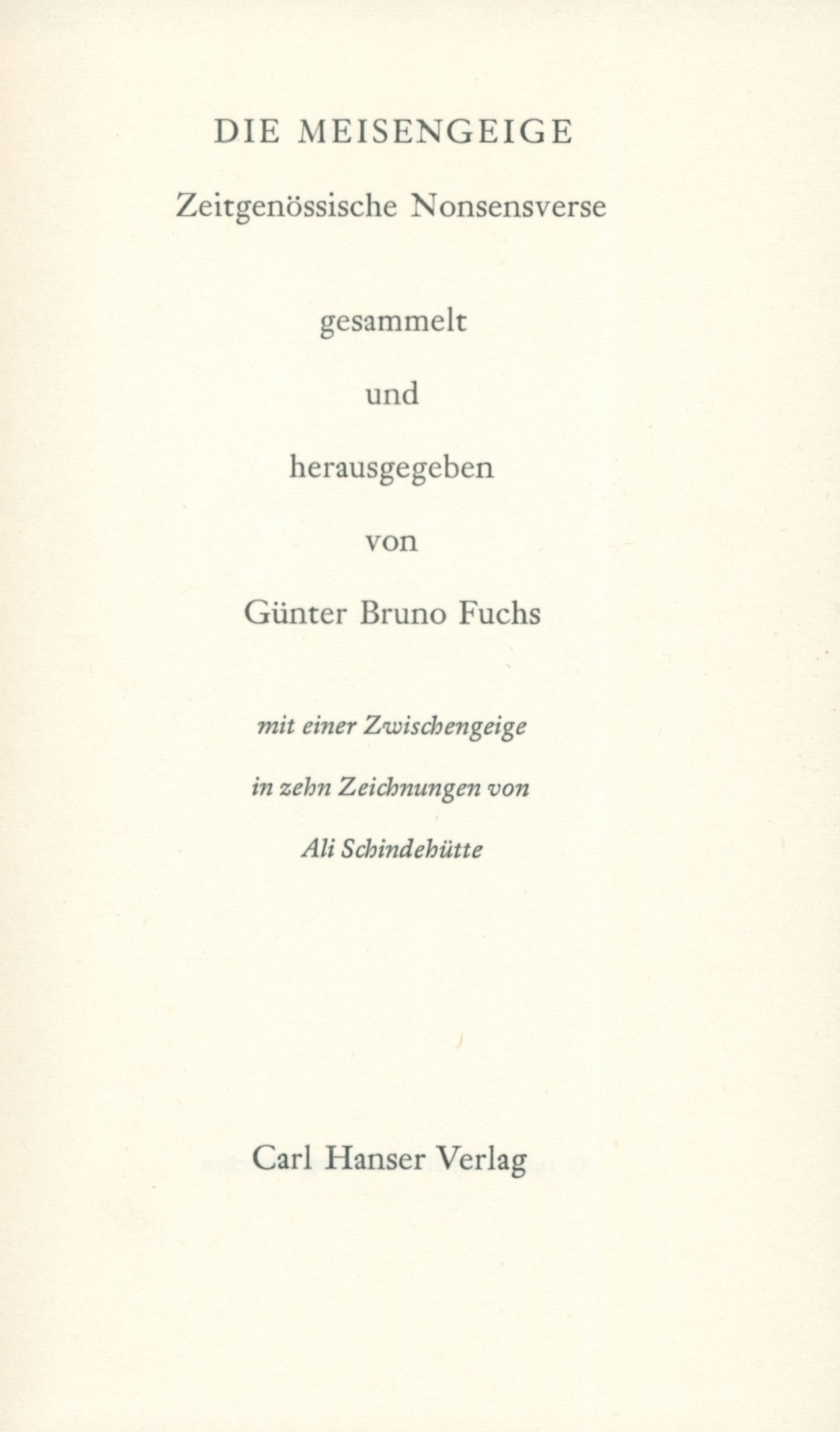 Title information Die Meisengeige / gesammelt und herausgegeben von Günter Bruno Fuchs ; mit einer Zwischengeige in 10 Zeichnungen von Ali Schindehütte ; Umschlag- und Einbandentwurf Günter Bruno Fuchs Personal name Fuchs, Günter Bruno, 1928-1977 (Compiler) (Editor) (Bookjacket designer) (Binding designer) (waw) Další autoři Schindehütte, Albert, 1939- (Illustrator) Corporation Carl Hanser Verlag (nakladatelství) (Publisher) J. Fink (tiskárna) (Printer) Publication München : Carl Hanser Verlag, 1964 Manufacture Stuttgart : Satz und Druck J. Fink Scope 190 stran : ilustrace ; 19 cm ISBN (Vázáno) Country Germany Language German Note Hnědá obálka s barevnou ilustrací, černý text (i na hřbetu). - Na záložkách text o knize od G. B. Fuchse, upoutávka na knihu Brevier eines Degenschluckers. - Červenohnědá plátěná vazba, na hřbeti nalepený štítek s názvem. - Ukázky. - Básně. - Doslov editora. - Obsah. - Přebal.