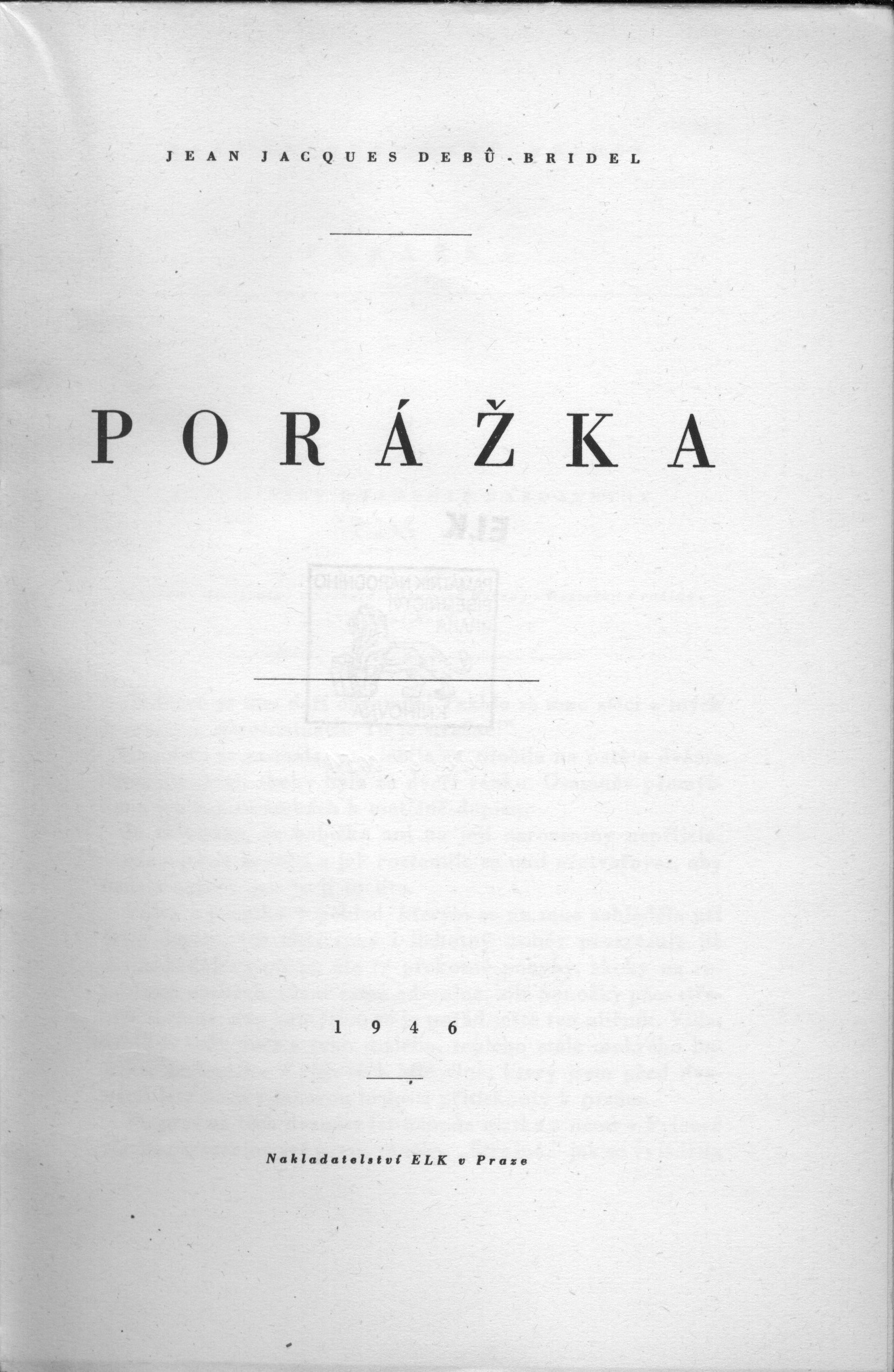 Title information Porážka / Jean Jacques Debu-Bridel ; [z francouzského originálu ... přeložila Ludmila Štětinová ; podle typografické osnovy Josefa Kaplického, který také navrhl obálku ...] Personal name Debu-Bridel, Jean Jacques, 1902-1993 (Author) Další autoři Štětinová, Ludmila (Translator) Kaplický, Josef, 1899-1962 (Typographer) (Bookjacket designer) Liehm, A. J. (Antonín Jaroslav), 1924-2020 (Author of afterword, colophon, etc.) Corporation Evropský literární klub (nakladatelství) (Publisher) M. Knapp (nakladatelství, tiskárna) (Printer) Edition statement První vydání Publication V Praze : Nakladatelství ELK, 1946 Manufacture (knihtiskárna M. Knapp) Scope 340 s. ; 22 cm ISBN brož. Country Czech Republic Language Czech Language of the original French Note Ilustr. na obálce. -- Text na zál. -- Nakl. značka. -- Doslov A.J. Liehma. -- Vysvětl. -- V tiráži značka nakl. sdružení Kmen. -- Na zadní zál. obál. čb. foto aut.