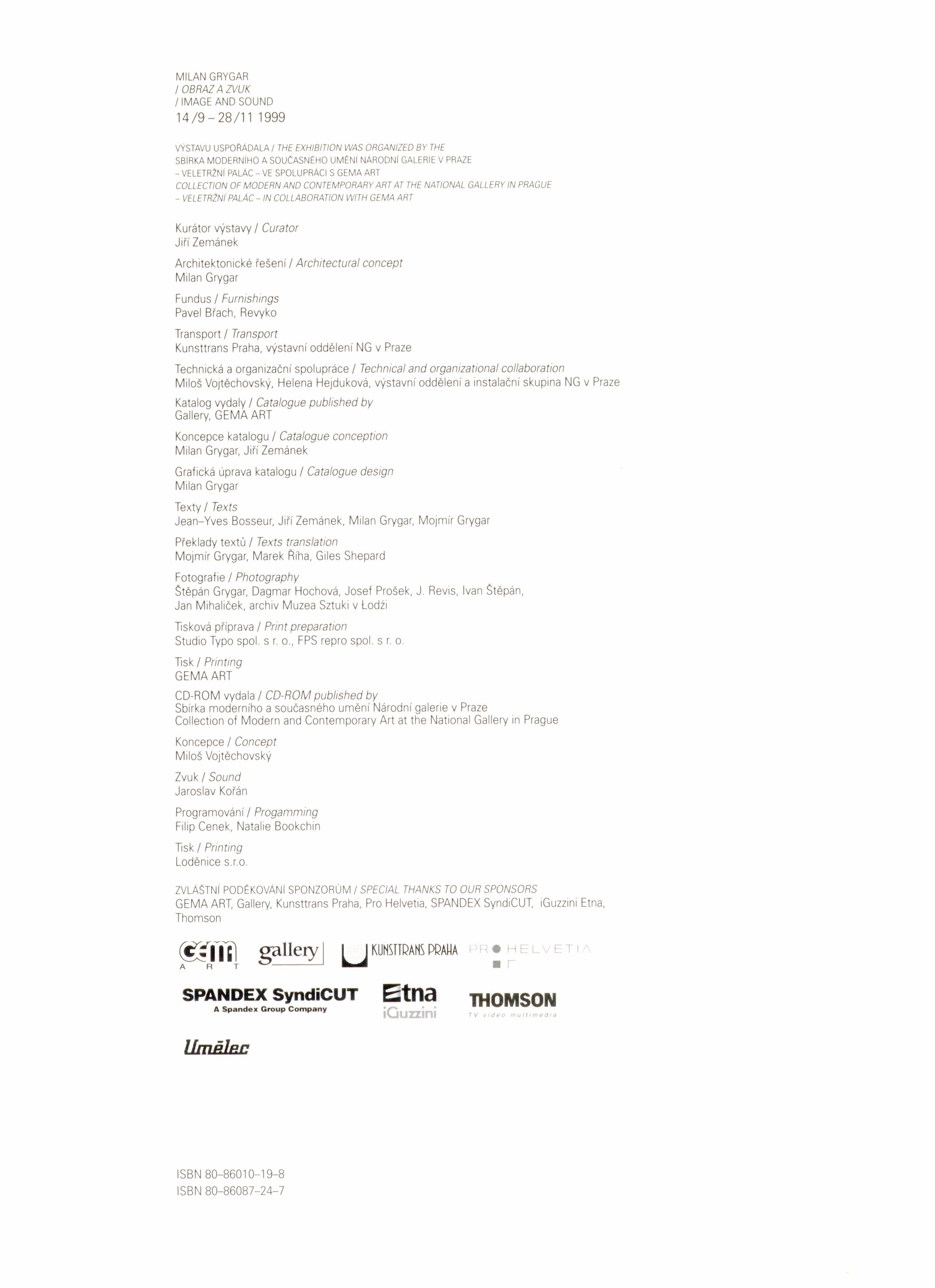 Title information Obraz a zvuk = Image and Sound : 14. 9-28. 11. 1999 / Milan Grygar ; koncepce katalogu = Catalogue conception Milan Grygar, Jiří Zemánek ; grafická úprava katalogu = Catalogue design Milan Grygar ; texty = Texts Jean-Yves Bosseur, Jiří Zemánek, Milan Grygar, Mojímír Grygar ; překlady textů = Texts translation Mojmír Grygar, Marek Říha, Giles Shepard ; fotografie = Photography Štěpán Grygar, Dagmar Hochová, Josef Prošek, J. Revis, Ivan Štěpán, Jan Mihaliček Personal name Grygar, Milan, 1926- (Author) (Compiler) (Graphic technician) (Author of introduction) Další autoři Zemánek, Jiří, 1953- (Compiler) (Author of introduction) Bosseur, Jean-Yves (Author of introduction) Grygar, Mojmír, 1928- (Translator) (Author of introduction) Říha, Marek (Translator) Shepard, Giles (Translator) Grygar, Štěpán, 1955- (Photographer) Hochová, Dagmar, 1926-2012 (Photographer) Revis, Julien (Photographer) Štepán, Ivan, 1937-1986 (Photographer) Prošek, Josef, 1923-1992 (Photographer) Mihaliček, Jan, 1965- (Photographer) Corporation Národní galerie (Praha, Česko) (Publisher) Gema Art (firma) (Publisher) (Printer) Publication Praha : Gema art, 1999 Scope 191 stran : barevné fotografie ; 31 cm ISBN 80-86010-19-8 (vázáno) 80-86087-24-7 Country Czech Republic Language Czech * English Language of the original Czech Note Text souběžně česky a anglicky. - Černá plátěná vazba. - Zdobená obálka a předsádky. - Frontispis. - Barevné fotografie a fotografické reprodukce. - Biografie. - Bibliografie. - Seznam vystavených děl.