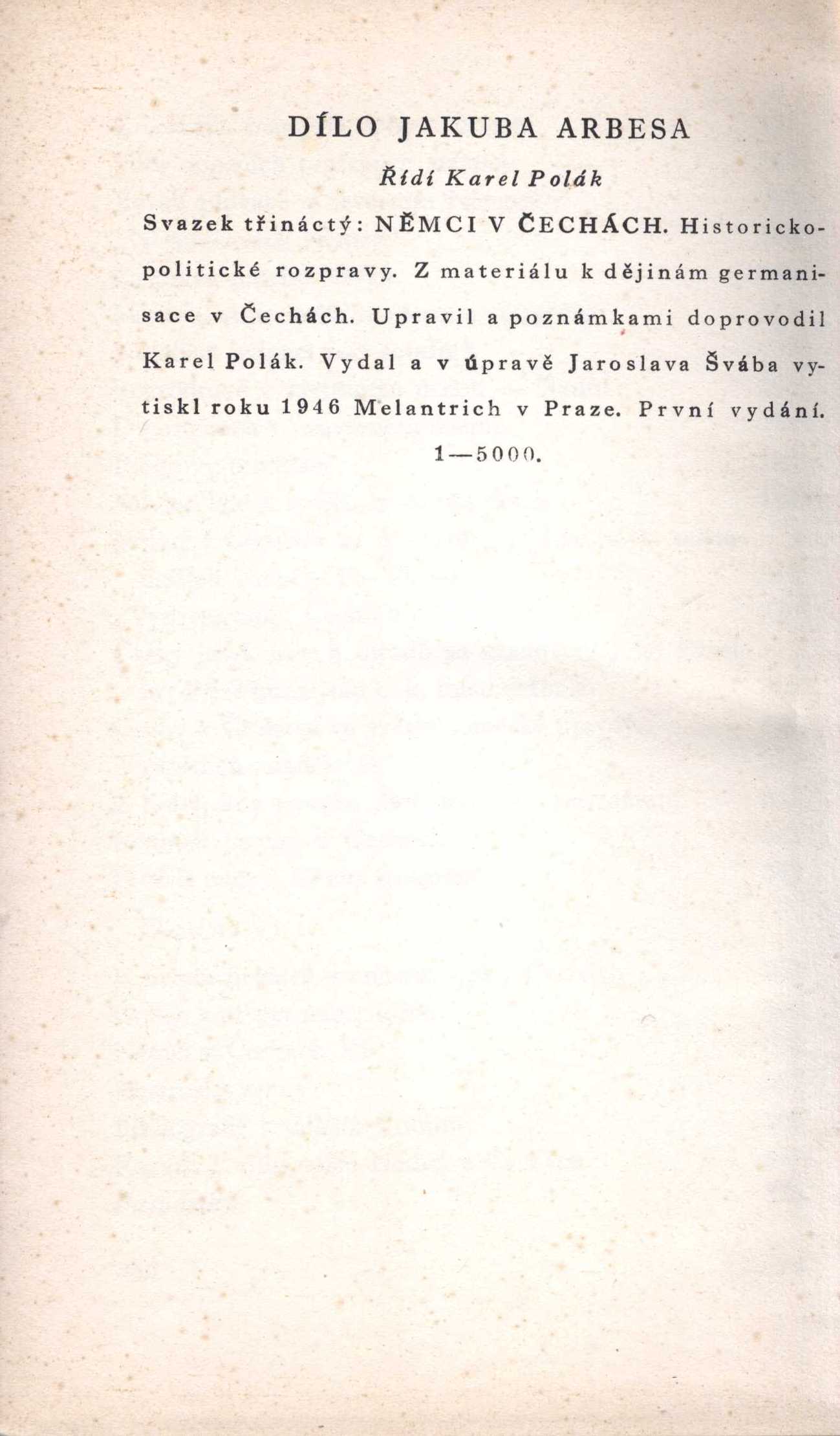 Názvové údaje Němci v Čechách : historicko-politické rozpravy : (z materiálu k dějinám germanisace v Čechách) / J. Arbes ; upravil a poznámkami doprovodil Karel Polák ; v úpravě Jaroslava Švába Osobní jméno Arbes, Jakub, 1840-1914 (Autor) Další autoři Polák, Karel, 1903-1956 (Editor) (Autor doslovu, tiráže atd.) Šváb, Jaroslav, 1906-1999 (Knižní grafik) Korp. Melantrich (nakladatelství) (Nakladatel, vydavatel) Údaje o vydání První vydání Nakladatel V Praze : Melantrich, 1946 Rozsah 386 stran ISBN (Vázáno) / (Brožováno) Edice Dílo Jakuba Arbesa ; sv. 13
